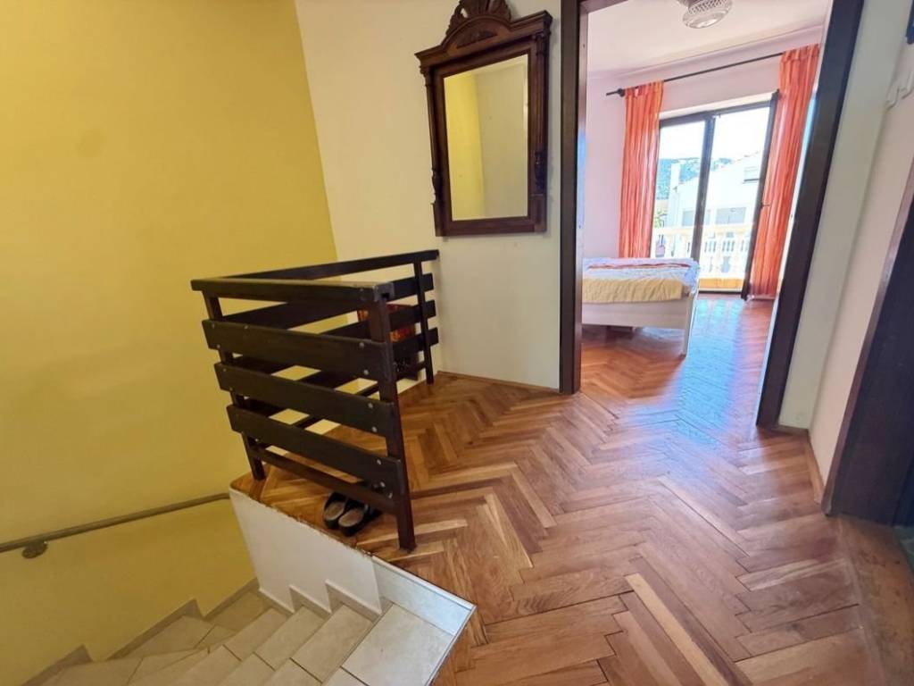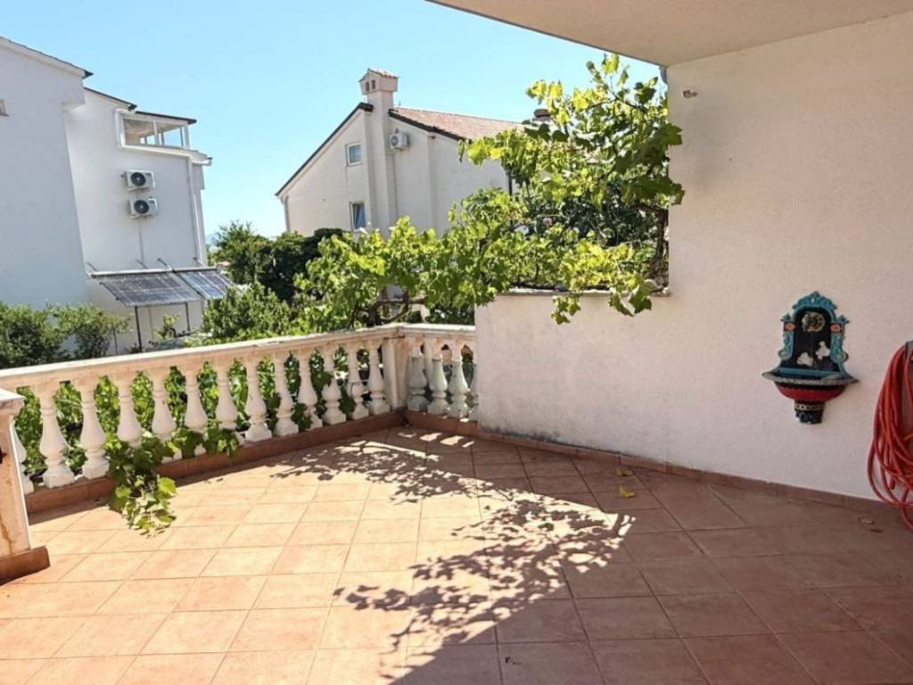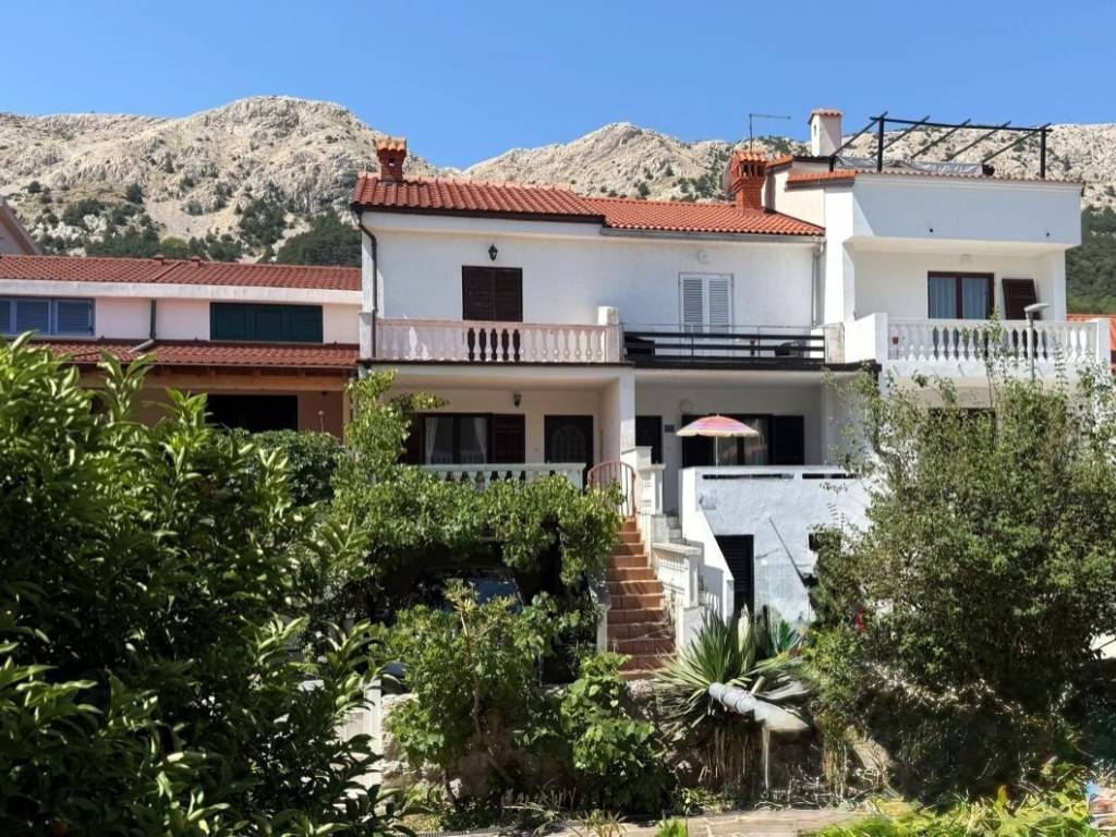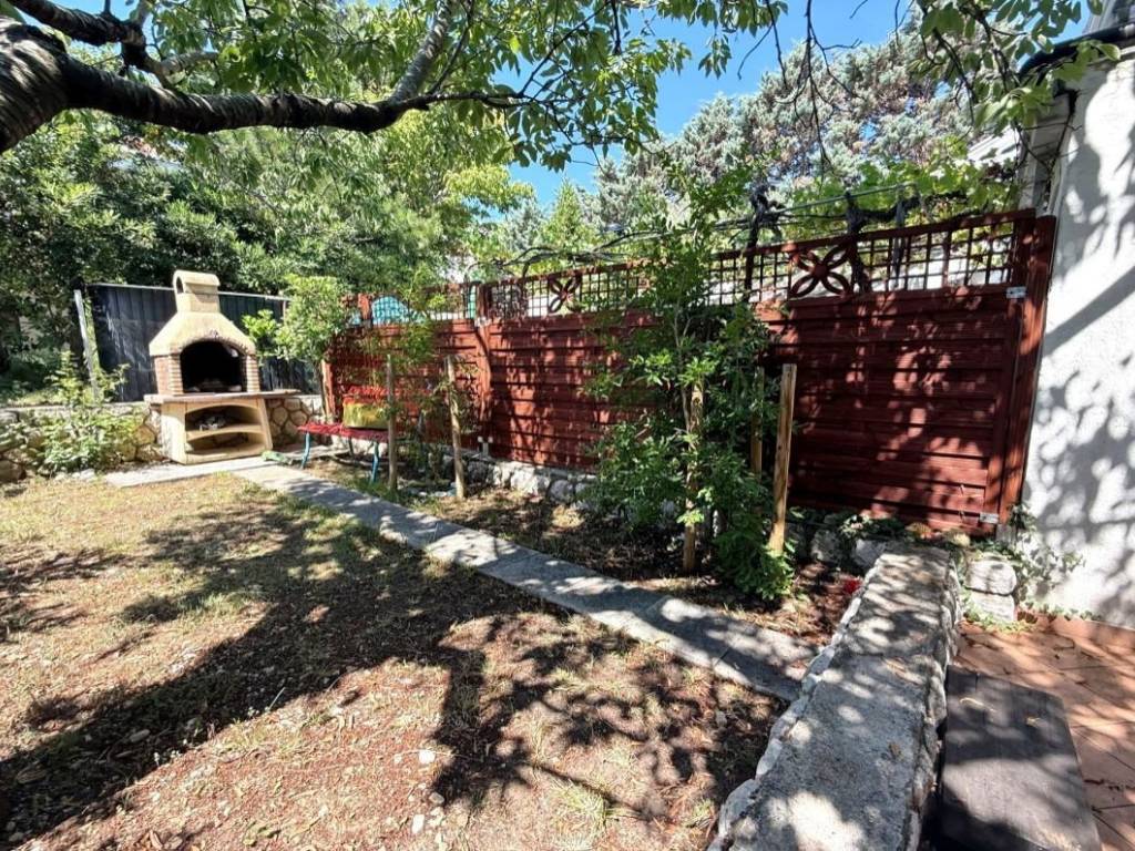 Otok Krk, Baška, prodaja kuće u nizu površine 60 m2, s okućnicom od 60 m2 i pogledom na more, na mirnoj lokaciji, 80 m od plaže. Kuća se sastoji od prizemlja s dnevnom sobom, kuhinjom i blagovaonom, spremištem, prednjom i zadnjom terasom s izlazom na okućnicu te prvog kata s dvije spavaće sobe, kupaonicom i terasom. Klimatizacija, parkirno mjesto.