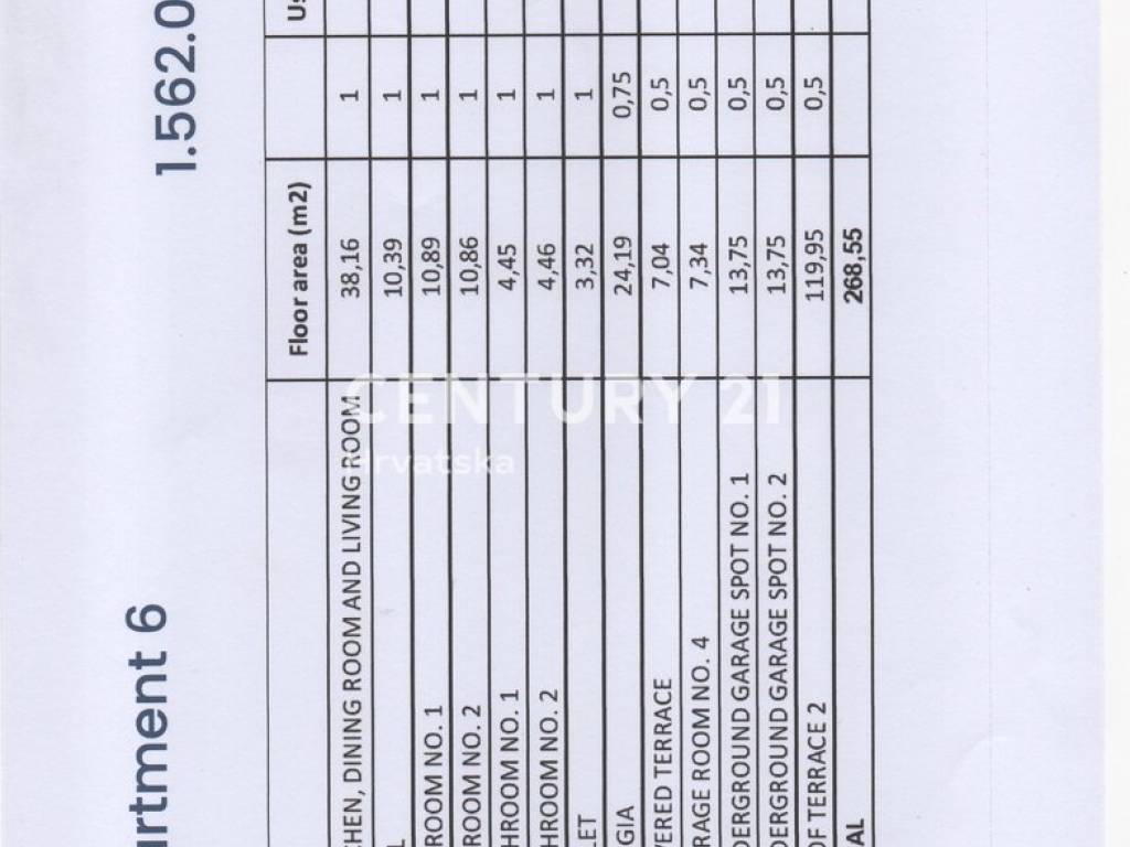 Apartment labeled 6 is located on the 2nd floor of the building, consisting of a living area (kitchen, dining room, and living room) of 38.16 m2, hallway, 2 bedrooms (10.89 m2, 10.86 m2), 2 bathrooms, separate WC, loggia 24.19 m2, covered terrace 7.04 m2, private rooftop terrace of 119.95 m2, storage room of 7.34 m2, 2 garage parking spaces each 13.75 m2.