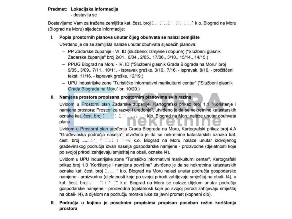 Prodaje se iznimno atraktivno građevinsko zemljište površine 2360 m2, smješteno u Biogradu na Moru u prvom redu do mora. Zemljište posjeduje važeću lokacijsku informaciju (koju možete vidjeti u prilogu) i smješteno je u mirnom predjelu.
