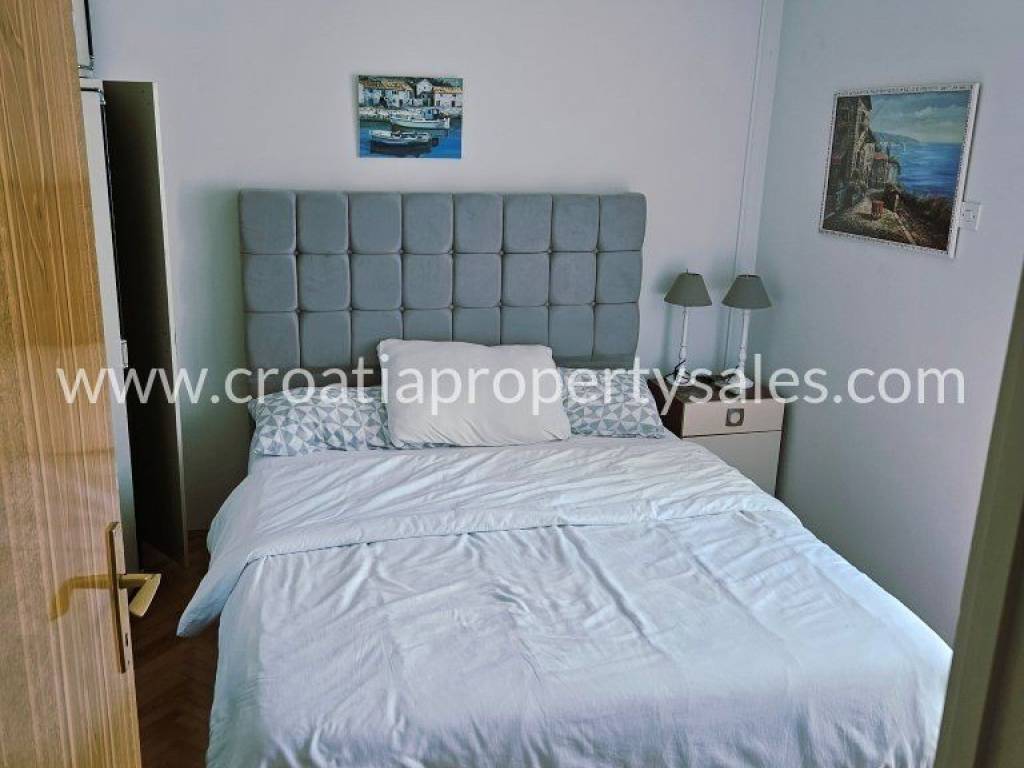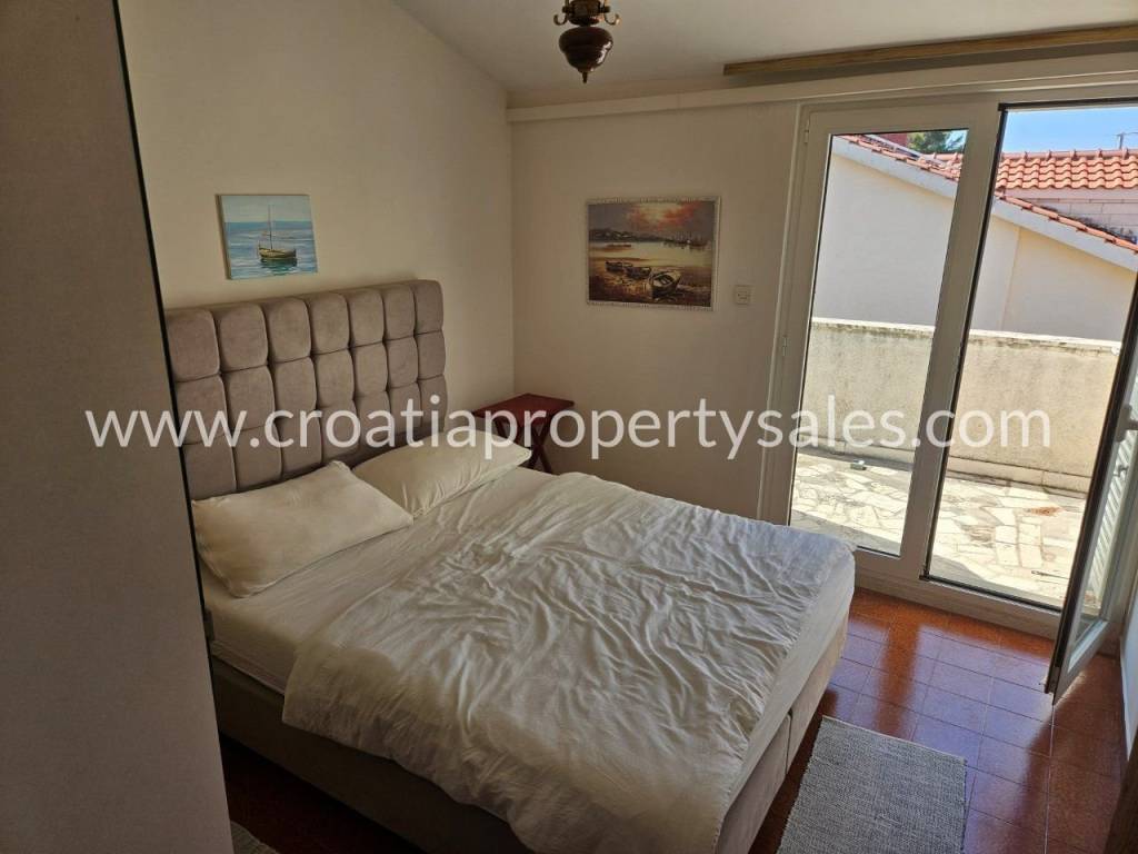 A lovely house in a peaceful location, situated just 50 m from the sea. Built in the late 1970s, this house consists of 3 floors and additionally has a garage/storage dug in ground. There is a lot of greenery surrounding the house and it has been kept nicely, making the property look much better. The house itself consists of a ground floor, 1st floor, and 2nd floor. From all floors, there is at least a partial sea view and from the upper floors, its more open and unobstructed. The ground floor consists of a hallway and a guest toilet, living room area in one room and the kitchen on another. The kitchen has been recently updated, and it’s fully furnished. Going up to the 1st floor, we are greeted with 3 bedrooms, out of which 2 have access to balconies, and a bathroom, completely updated. The views from this floor are nice and open. Second floor consists of 2 bedrooms, 1 bathroom and a small storage. In stead of the 3rd bedroom on this floor, there is a bigger balcony, with an even better sea view. On this floor, the bathroom would require an update but can still be used as-is. On the left side of the house on the ground floor is a covered terrace for enjoyment and even offers a nice, partial sea view from it. A small garden in the front has been kept quite nicely and it’s the first thing that you notice upon entering from the street.Additionally, there is a storage space under the house. It can also be a garage for a smaller car, or it can be even converted into an office or other amenities. Overall, the house is very nice, in a great location. It will especially be interesting to people who enjoy peace and quiet, surrounded by pine trees and green areas. Just a couple of steps from the house is a small, natural rocky beach and it’s almost always empty. Its in very good condition and can be used right away, with some updates that can be done eventually.