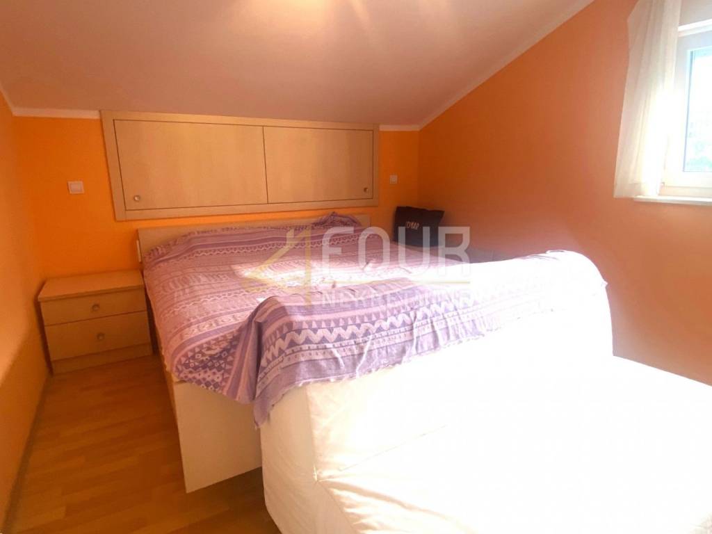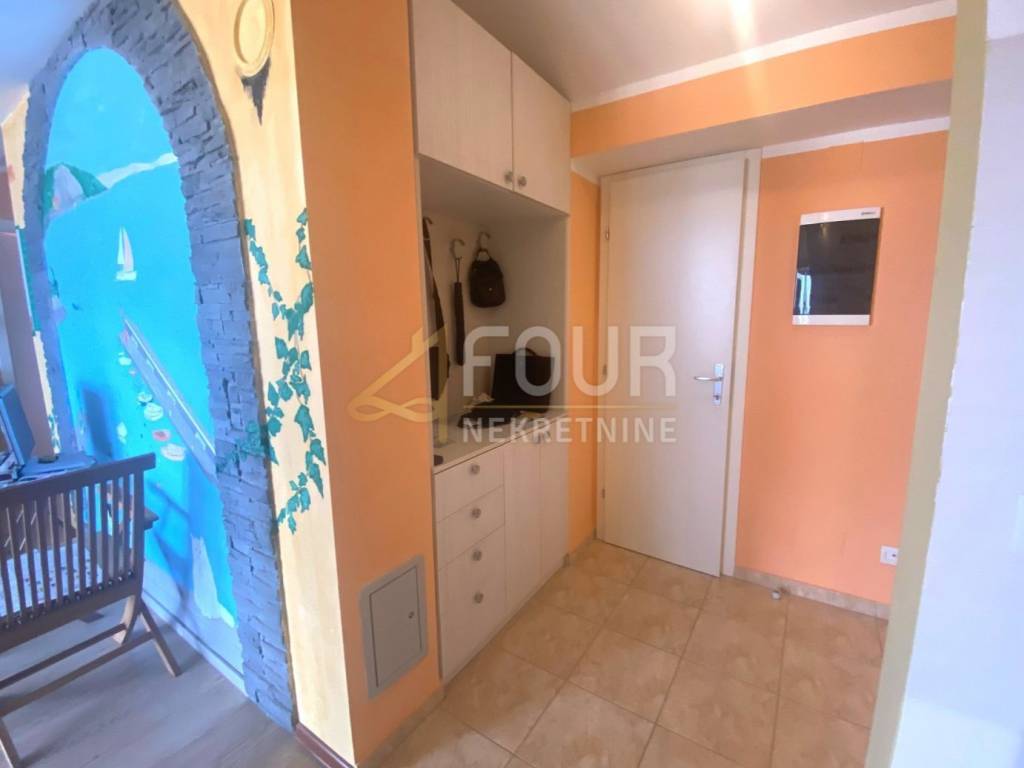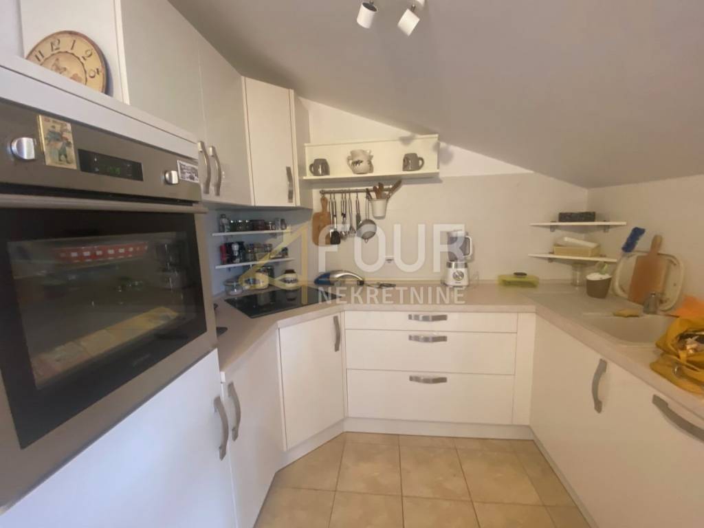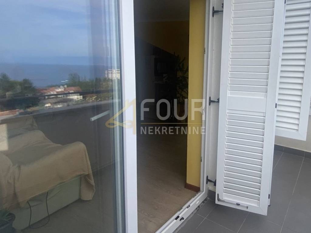 For sale is a modern and bright apartment in Lovran, located in the attic of a newer building. It covers a total of 73.99 m² and consists of an entrance area, kitchen connected to the living room and dining area, two bedrooms, a bathroom, and a balcony with a beautiful sea view. The apartment also includes a storage room on the ground floor and two parking spaces.