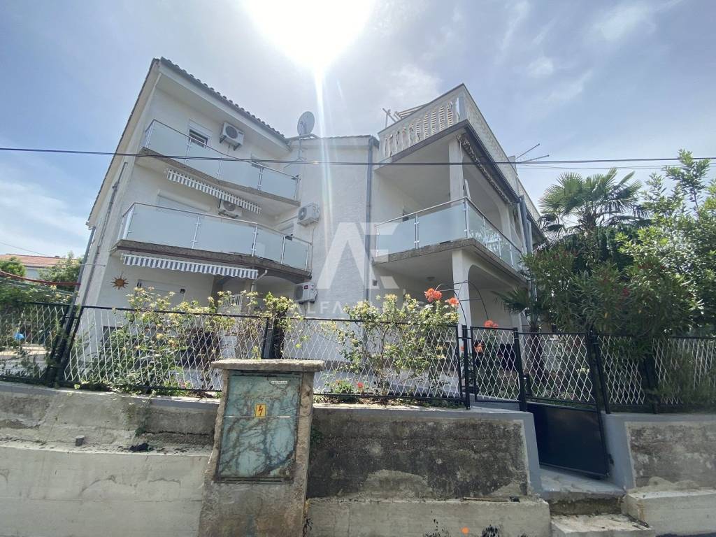 Malinska, surroundings, semi-detached house with 5 apartments, only 600m from the beach. The semi-detached house is located in the vicinity of Malinska, with a total net living area of ​​220m2, and consists of two floors. On the ground floor there is a studio with one bedroom, bathroom and kitchen. On the first floor there are two two-room apartments, each of which has access to a balcony with a beautiful panoramic view of the sea and the green belt. On the second floor there are also two apartments, each of which has its own covered terrace overlooking the sea. Within the garden there is a covered parking space for 3 vehicles and two uncovered parking spaces. The semi-detached house also contains a summer kitchen with its own toilet. In total, it contains 7 bedrooms, 5 kitchens and 5 bathrooms. Each apartment has air conditioners. The documentation is in order.