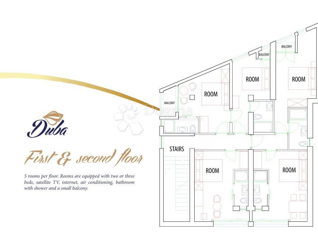 NA PRODAJU – OBITELJSKI BOUTIQUE HOTEL UZ MORE, MALA DUBA, MAKARSKA RIVIJERA  Na samo nekoliko koraka od kristalno čistog mora, u srcu idiličnog ribarskog mjesta Mala Duba, prodaje se potpuno renoviran pansion – boutique hotel s dugogodišnjom tradicijom gostoprimstva. Objekt je smješten u prvom redu do mora, okružen borovom šumom i prirodnim mirom koji ovo mjesto čini posebnim.  Osnovne informacije  Lokacija: Mala Duba, Makarska rivijera, Dalmacija  Površina objekta: 416 m²  Etaže: prizemlje + 3 kata  Godina izgradnje: 1967.  Godina potpune renovacije: 2014.  Kategorizacija: Pansion  Sadržaj objekta  U prizemlju se nalazi restoran kapaciteta 34 sjedeća mjesta u zatvorenom prostoru te dodatnih 30 mjesta na terasi uz more. Gostima su na raspolaganju i bar, recepcija, profesionalna kuhinja, sanitarni čvorovi za goste te tuš i WC za osoblje. Uz restoran se prostire terasa od cca 50 m², dok je ispred objekta prostrana terasa od cca 100 m² s oko 60 sjedećih mjesta u hladu borova – idealno mjesto za opuštanje uz more.  Na prvom i drugom katu nalazi se ukupno 10 soba, svaka s vlastitom kupaonicom, klimom, TV-om, internetom i balkonom. U svim sobama izvedene su instalacije za mini-kuhinju, što omogućuje jednostavnu prenamjenu u 6 apartmana.  Treći kat zauzimaju dva potpuno opremljena apartmana:  Apartman 1 (40 m²): spavaća soba, kuhinja s blagovaonicom i dnevnim boravkom s kaminom, kupaonica s finskom saunom i masažnom kadom, smještaj za 4 osobe.  Apartman 2 (20 m²): spavaća soba, kuhinja s blagovaonicom i dnevnim boravkom, kupaonica s turskom saunom i masažnom tuš kabinom, smještaj za 3 osobe. Iz apartmana se izlazi na krovnu terasu od cca 30 m², s pogledom koji oduzima dah – prema Hvaru i Braču.  Dodatne značajke  Centralno etažno grijanje u apartmanima  Klima uređaji u sobama i apartmanima  Recepcija, profesionalna kuhinja i bar  12 kupaonica + 2 dodatna WC-a za goste restorana  3 prostrane terase ukupne površine oko 180 m²  Lokacija i okruženje  Mala Duba je mirno dalmatinsko mjesto koje je sačuvalo autentični mediteranski duh. Sa svega 50 stanovnika zimi i do 8000 posjetitelja ljeti, nudi savršen balans mira i turističke živosti. Šljunčane plaže, duga šetnica uz borovu šumu, kristalno more i nezaboravni zalasci sunca čine ovo mjesto pravim draguljem Makarske rivijere.  Posebna prilika  Objekt se može nastaviti koristiti kao obiteljski hotel ili jednostavno prenamijeniti u luksuzne apartmane za turistički najam. Zahvaljujući iznimnoj lokaciji – doslovno 10 metara od mora, mogućnosti su brojne: boutique hotel, vila s apartmanima, wellness retreat ili ekskluzivna rezidencija.  Razgledavanje nekretnine moguće je isključivo uz potpis Ugovora o posredovanju, u skladu sa Zakonom o zaštiti podataka i Zakonom o posredovanju u prometu nekretnina.  Za više informacija i dogovor termina razgledavanja, obratite se s povjerenjem.  Marija Bošnjak Makarska tel: +385 95 37 27 47 1 email: marija.bosnjak@dogma-nekretnine.com  ID KOD AGENCIJE: ST4247  Marija Bošnjak Asistent u posredovanju Mob: 095/372-7471 Tel: +385 21 293 201 E-mail: marija.bosnjak@dogma-nekretnine.com www.dogma-dalmacija.com