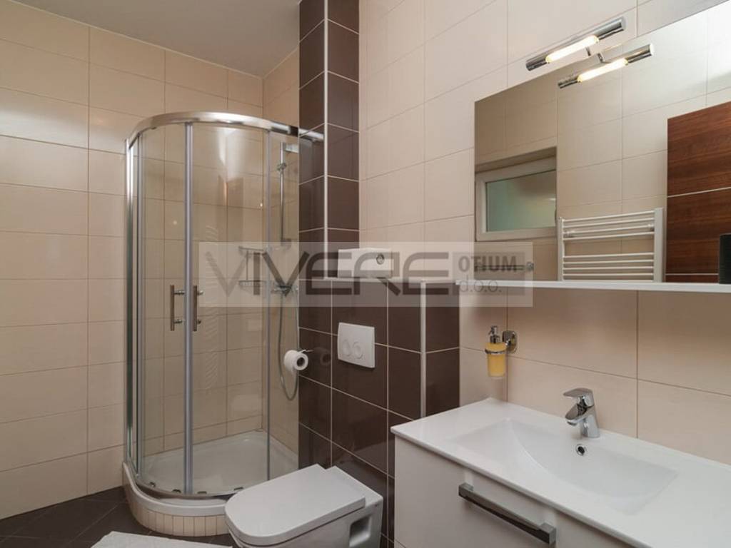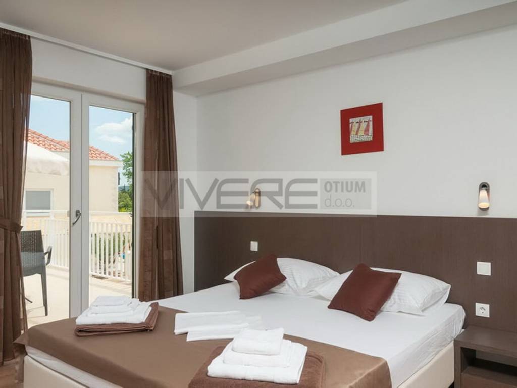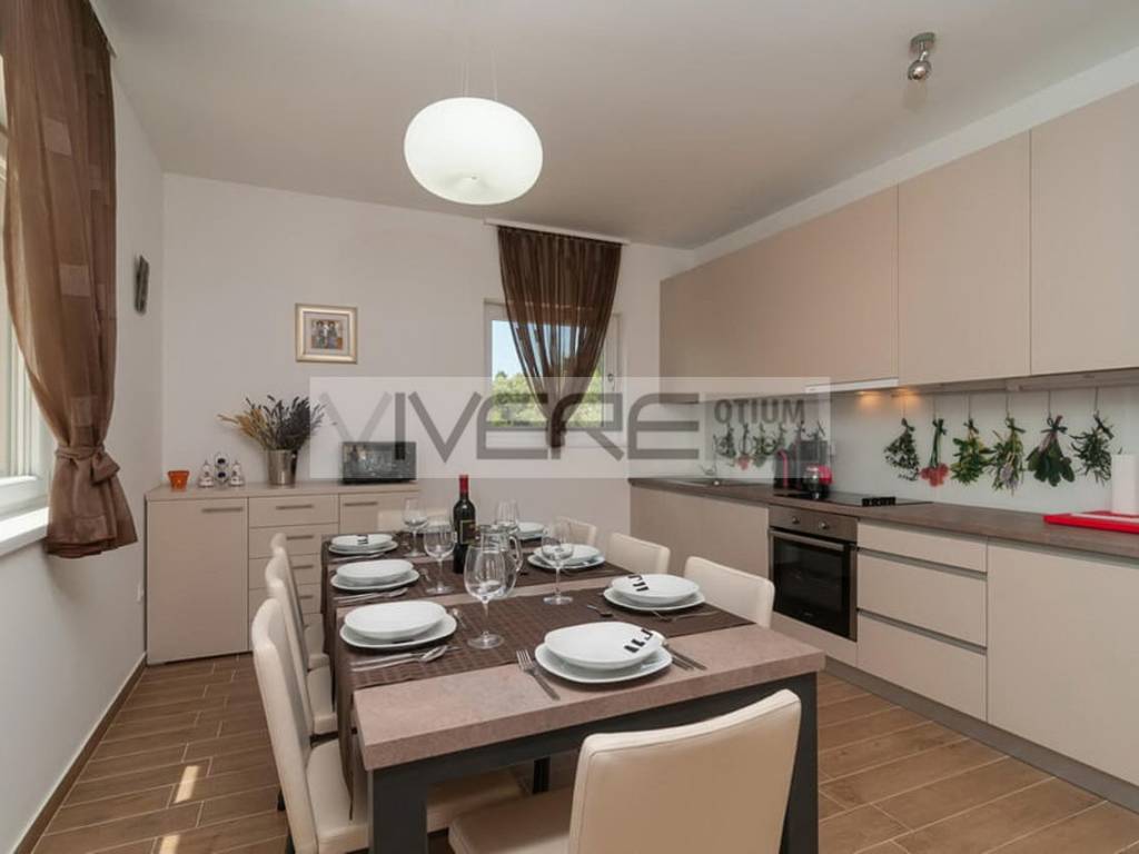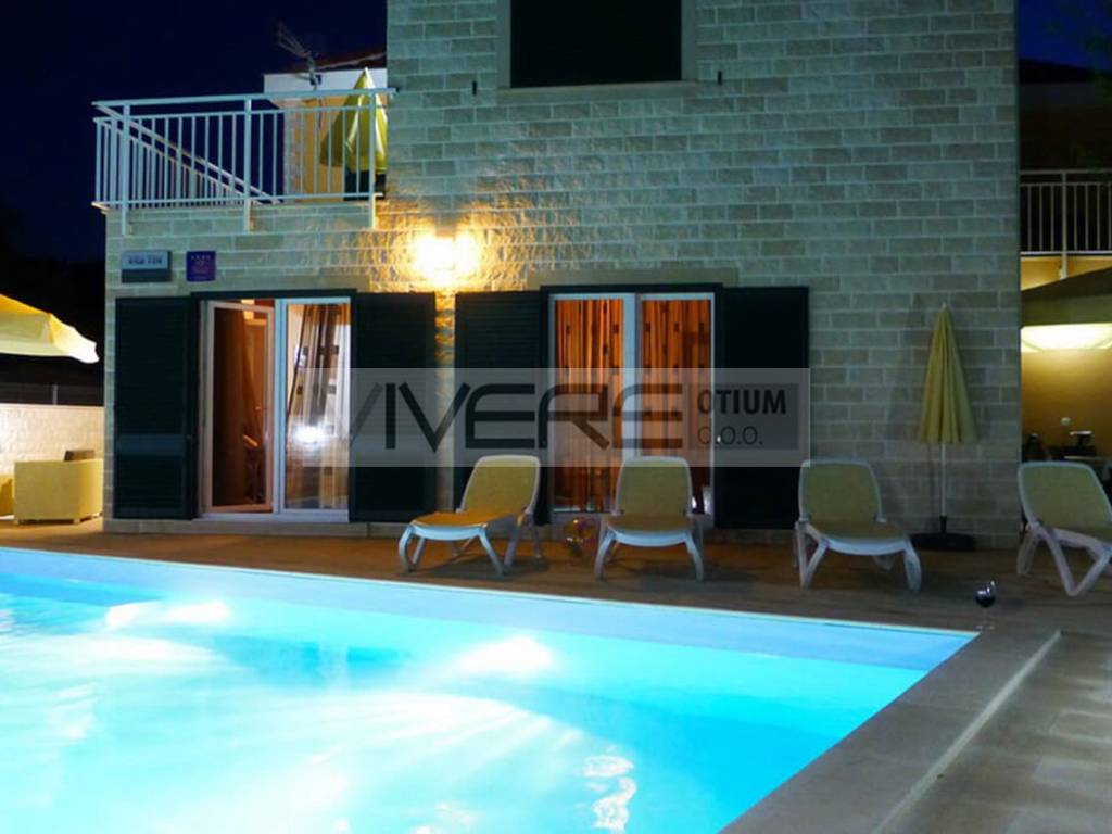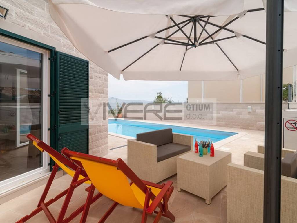 The living area spread over two levels. After entering the living area on the ground floor there is a long and wide corridor leading to the really spacious living room and open style kitchen with a dining table in the corner with big glass doors. The living room features access to the spacious terrace of approx. 100 sqm with garden, pool and outdoor fireplace. There are further a bedroom, a bathroom with shower, guest toilet, little storage room and a built-in closet in the corridor. Internal stairs lead to the first floor, which consists of two bedrooms, each with its own en-suite bathroom. Both bedrooms have access to a private balcony with gorgeous views to the sea and the Dalmatian coastline. The villa is sold fully furnished and equipped.