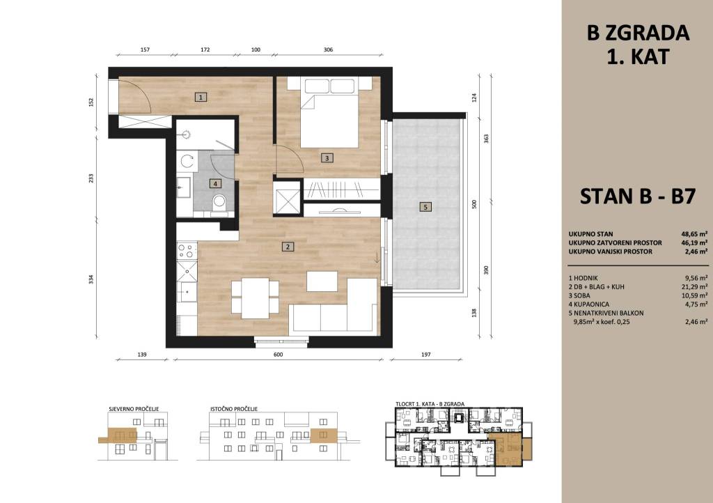 SVETA KLARA - LUKORANSKA ULICAModeran dvosoban stan 51.78 m² na prvom katu novogradnje - useljenje 05/2027.Na prodaju je stan oznake B7 koji se nalazi na prvom katu zgrade B (ukupno 14 stanova).Stan se sastoji od:ulaznog hodnika,otvorenog prostora koji objedinjuje kuhinju, blagovaonicu i dnevni boravak s izlazom na nenatkriveni balkon od 9.85 m² (NKP 2.46 m²),spavaće sobe,kupaonice.Stanu pripada nenatkriveno parkirno mjesto, uz mogućnost kupnje spremišta.Zgrada je izgrađena prema najvišim standardima moderne gradnje:Daikin dizalica topline za podno grijanje,hlađenje putem Daikin klima uređaja,PVC stolarija s trostrukim staklima i električnim roletama,fasadni sustav 12 cm,protuprovalna vrata,keramika prve klase,Galeković parketi,visina stropa 260 cm.Odlična mikrolokacija - u neposrednoj blizini nalaze se škola, vrtić, trgovine, autobusna linija, Savski most (tramvaj), Arena Centar, Avenue Mall i Bundek.Za dodatne informacije i razgled, stojimo vam na raspolaganju!