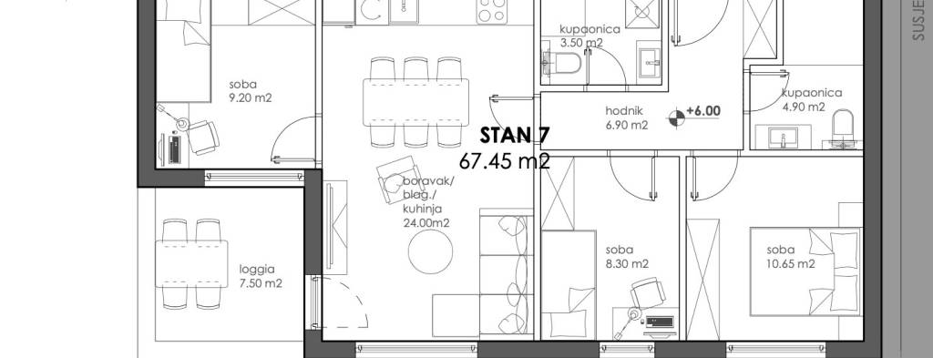 Sastoji se od hodnika, 3 spavaće sobe, dnevnog boravka, kuhinje s blagovaonicom, 2 kupaonice te lođe.