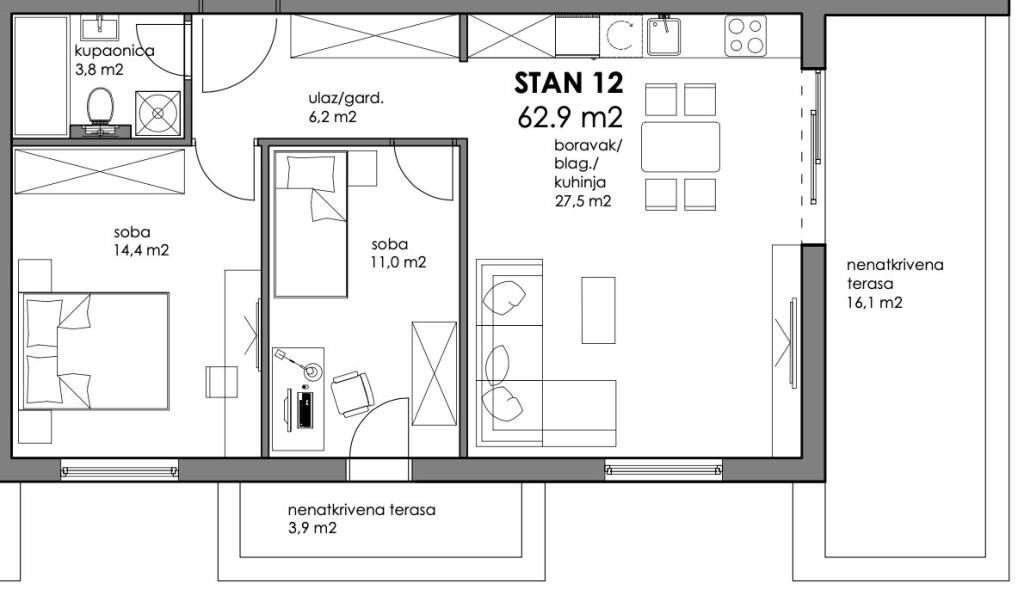 Sastoji se od ulaza/garderobe, kupaonice, 2 spavaće sobe, dnevnog boravka, kuhinje s blagovaonicom te nenatkrivene 2 nenatkrivene terase.