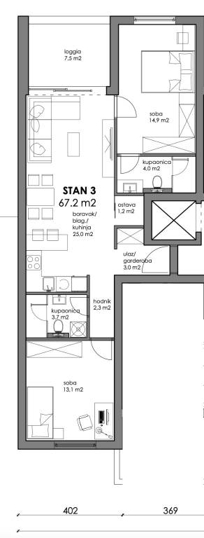 Sastoji se od hodnika, ulaza/garderobe, ostave, 2 kupaonice, 2 spavaće sobe, lođe, dnevnog boravka te kuhinje s blagovaonicom.
