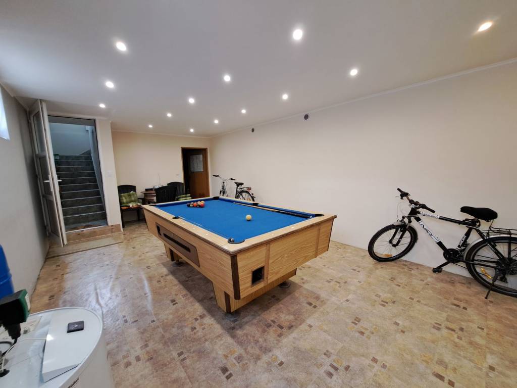 En el sótano hay un espacio para el entretenimiento equipado con una mesa de billar y áreas confortables para sentarse y reunirse.