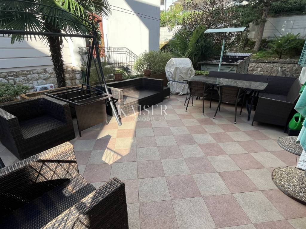 Kaiser Immobilien puts on the market a beautiful apartment in the center of Opatija. It is located on the ground floor of the building, which has two more floors above. The apartment has a large, spacious terrace of 30 m2 under which there is a garage, which is truly unique for the very center of Opatija. There is another 15 m2 of uncovered parking in front of the garage. The area of the apartment is 70 m2, it consists of two bedrooms, kitchen, living room, bathroom and toilet. The apartment also has two woodsheds located one floor below, each 12 m2, a total of 24 m2. Heating is central with pellets. The terrace offers a partial view of the sea. It is located in a quiet street with lots of greenery. The roof is new, and the facade is in very good condition. It takes 5 minutes to walk to the nearest beach. Call for a viewing of this unique apartment in the very center!