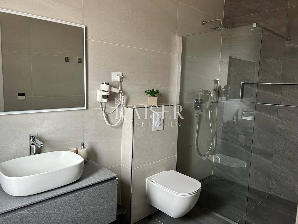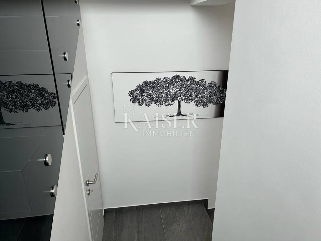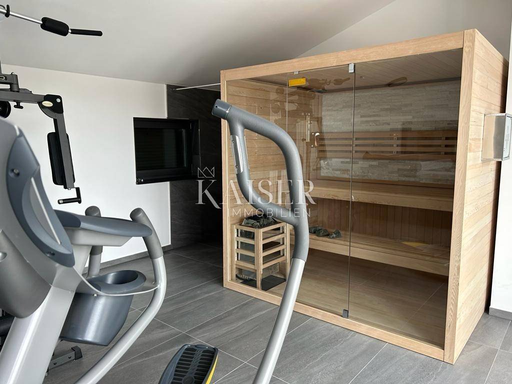 Kaiser Immobilien presents a new, modern, fully furnished villa only 5 km from the city of Poreč. The villa is located in a tourist resort, very popular for both foreign citizens and local residents. The villa is located in a row, it is connected to another similar villa, however, this does not reduce its value and its privacy and size. The villa is newly built, with a very modern and superior design. It consists of ground floor, first floor and attic. Everything is fully equipped with beautifully designed furniture and the highest quality joinery. On the ground floor of the villa there is a spacious living room with kitchen and dining room. The entire area is of the open space model, and offers you exit from two sides of the villa and exit to a nice spacious pool and an open terrace. On the floor of the villa there are bedrooms with their own bathrooms, all connected by corridors. What makes this villa particularly interesting is the attic, which has its own private fitness area with top-quality equipment and a jacuzzi. There is a beautiful spacious jacuzzi with a panoramic view of the village and the sea. And if you get tired exercising on the machines and want to relax further, you can do so in the private sauna located in the same sports hall. Exiting the space, you come to a large, spacious terrace that offers you a wonderful view, which you can arrange and equip as you wish. The entire villa is heated under the floor, with a heat pump, and in the summer, when it's really hot, cooling is organized with as many as 6 air conditioners and 2 compressors. The power connection is three-phase with a maximum power of 22 kw. The villa is equipped with a special selection of furniture from Italy, Austria and other neighboring countries. It is very important to note that the villa was not rented, has no damaged furniture and is completely new. If you want this beautiful, new, modern villa to become your new home, your new oasis of life, contact the Kaiser Immobilien agency.