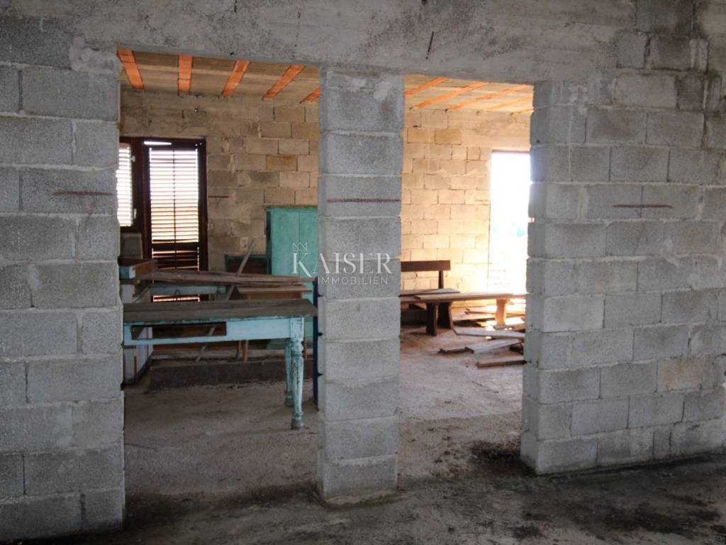 Kaiser Immobilien puts on the market Unfinished Detached House in Slivnica with a view Location: Slivnica, near Posedarje We offer for sale an unfinished detached house located in a quiet settlement of Slivnica, near Posedarje. The house consists of a ground floor and a first floor, with a total gross floor plan area of 226 m². The main building: - Ground floor: A space of 50-60 m² that can be used as a residence or storage, while the remaining part was intended for a water tank, but can be repurposed for residential and other purposes - Floor: An open space with a terrace that can be adjust according to the wishes of the future owner. Auxiliary building: - Gross area: 47 m² - Content: Hallway, three rooms on the ground floor, and an attic. - Status: Needs to be renovated. Yard: A large yard of 1348 m² provides enough space for arranging the yard and outdoor facilities. Location: Enjoy the harmony of nature and the comfort of modern living with our properties that are now available for sale! These extraordinary facilities are located on the south side, ensuring plenty of sunlight throughout the day, thus creating a warm and pleasant atmosphere. Each property offers a mesmerizing view of the expanse of greenery and unvisited area of the forest, providing you with the perfect balance of privacy and closeness to nature. Ideal for anyone looking for a quiet and relaxing environment with modern comfort. Do not miss the opportunity to become the owner of these extraordinary properties. Contact us for more information and arrange a viewing. Your new home in the green paradise is waiting for you! - Peaceful and quiet environment - Shop within 500 m - The first beach is 3.8 km away Documentation: - The houses have a certificate that they were built before 1968. - The operating permit for buildings built before 1968 is in the process of being issued. An ideal opportunity for those looking for a project to complete and adapt to their own needs. For more information and to arrange a tour, feel free to contact us.