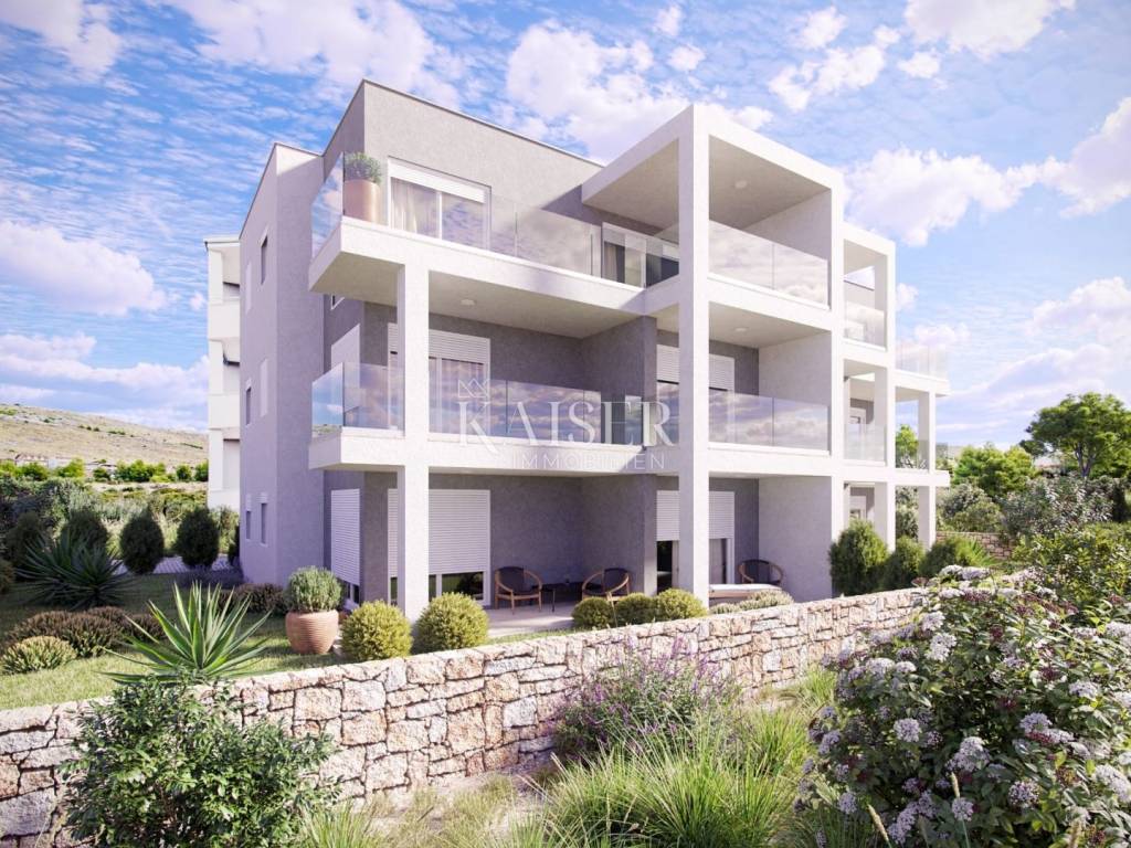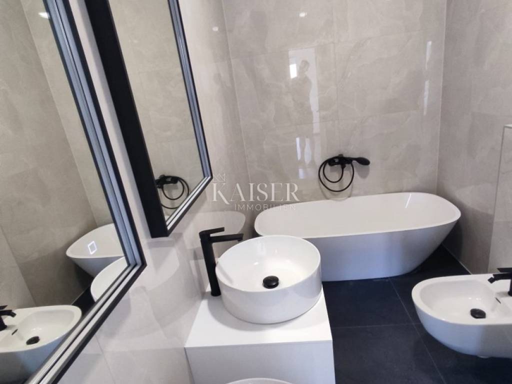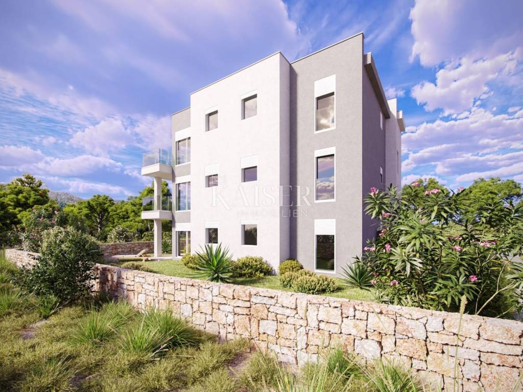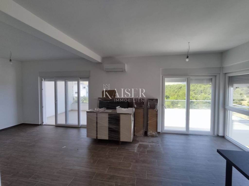 Kaiser Immobilien is proud to present a unique penthouse apartment located on the second and top floor of a modern residential building under construction. This luxurious new building is located in an exceptional location, in a picturesque bay with crystal clear sea, offering a perfect blend of contemporary architecture and untouched nature. The apartment with a total living area of 97.4 m² is designed to provide maximum comfort and functionality. It consists of: A spacious open-concept living room, connected to the kitchen and dining room (total 28.6 m²), which is flooded with natural light thanks to large glass walls. Three comfortable bedrooms (7.25 m² each) that ensure privacy and peace. Two modern bathrooms (5.2 m² and 5.9 m²). An entrance hall with a wardrobe space (6.7 m²). The living room opens onto a spacious covered terrace of 13.3 m², ideal for relaxing and enjoying the view of the Mediterranean greenery. In addition, the apartment has a balcony of 6.9 m², accessible from one of the bedrooms. The building is characterized by top quality construction and built-in materials, including modern joinery, first-class ceramics and sanitary ware, and heating and cooling systems that guarantee a pleasant stay throughout the year. Each apartment also has a secured parking space. This property is a perfect opportunity for those looking for a luxurious living space by the sea or an extraordinary investment for tourist rental with high return potential. The location in a quiet bay, just a few steps from the beach, and yet close to all necessary amenities, makes it an ideal haven for escaping the hustle and bustle of the city. Do not miss the opportunity to become the owner of this exceptional property in one of the most beautiful locations on the Adriatic. The agency commission for the buyer is 3% + VAT and is paid in the case of purchasing a property, upon conclusion of the first legal act. Viewing the property is possible only with the prior signing of a real estate brokerage contract. If you would like to visit the property in person, please contact: Joško Bašić E-mail: josko@kaiser-immobilien.hr Tel: +385-91-511-2993 http://kaiser-immobilien.hr/
