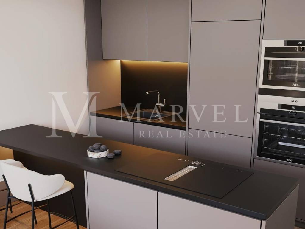 The apartment also includes two parking spaces, equipped with electric car charging stations, allowing easy charging of electric vehicles.