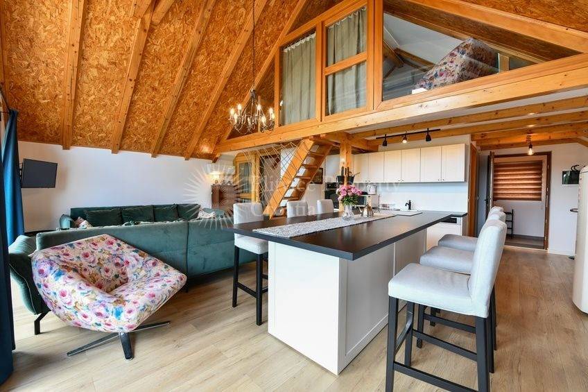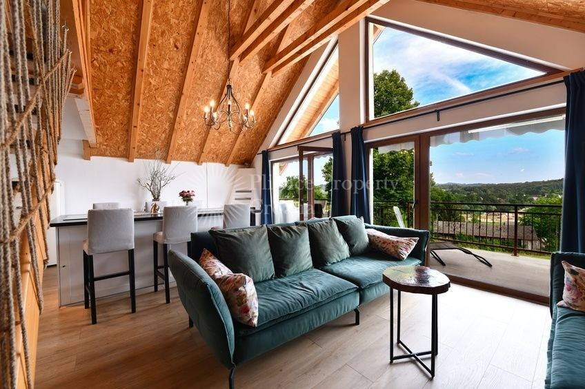 The ground floor features a bedroom, a bathroom, a private sauna, and a jacuzziperfect for relaxationalong with a terrace area ideal for outdoor seating. The first floor boasts an open-plan kitchen, dining area, and living room, seamlessly connected for easy living, plus a bathroom and an additional bedroom. From the open-plan space, you can step out onto a beautiful balcony with sweeping views of the surrounding nature.
