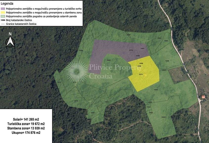 Ova velika poljoprivredna nekretnina prostire se na 174.791 m i sastoji se od 24 povezane parcele, što predstavlja rijetku priliku za vlasništvo velike površine u području Slunja. Zemljište nudi uravnoteženu kombinaciju pašnjaka i šume, što ga čini pogodnim za poljoprivrednu uporabu i održivo šumarstvo.