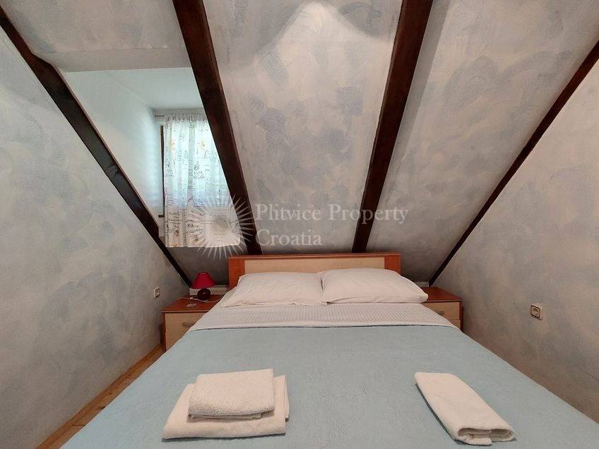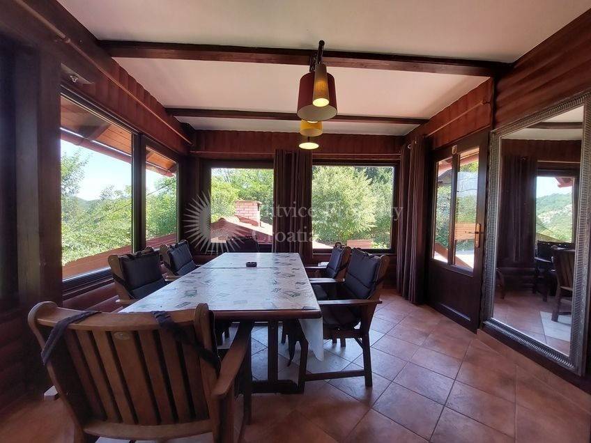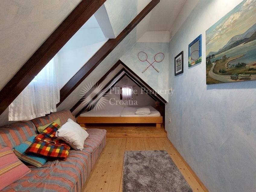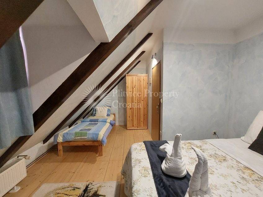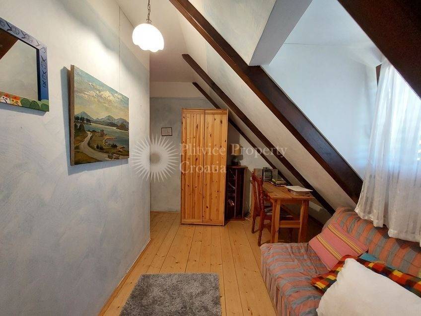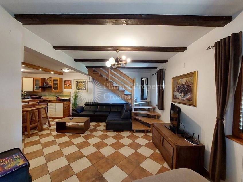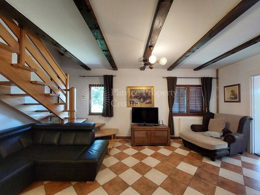 On the ground floor, there is a welcoming sitting area with large windows overlooking the Korana River, a living room, kitchen, bathroom, and one bedroom. The first floor features three additional bedrooms and another bathroom, ensuring plenty of accommodation for visitors.