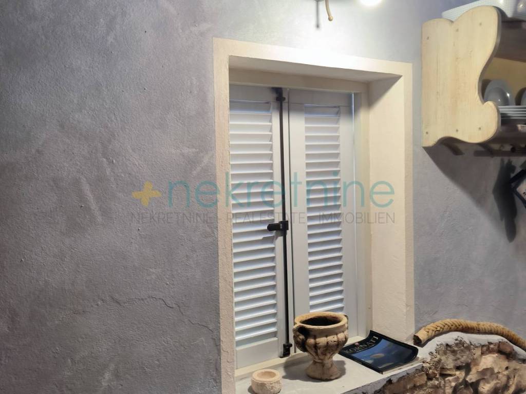 Kuća je u potpunosti renovirana i namještena visokokvalitetnim namještajem, prilagođenim mediteranskom stilu. Zidovi debljine 70-100 cm izrađeni su od bijelog kamena, a nova drvena stolarija opremljena je komarnicima.