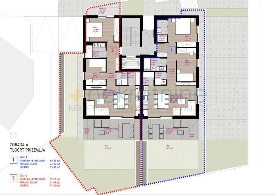 Stan A2 smješten je u prizemlju stambene zgrade sa šest stambenih jedinica, ukupne stambene površine 58,9 m. Ima dvije spavaće sobe i dodatne sadržaje poput natkrivene terase, vrtne terase, vrta, spremišta u podzemnoj garaži te vanjsko i garažno parkirno mjesto. Ukupna neto prodajna površina stana iznosi 105,8 m (u zemljišnim knjigama je upisana korisna površina od 94,40 m zbog različitih faktora obračuna površine vrta, s obzirom da je vrt visokokvalitetno uređen posađene su 24 vrste mediteranskog bilja, ugrađen sustav za navodnjavanje, struja i voda na terasama, popločane staze i ograđeno dvorište, s prodajnom površinom obračunatom po koeficijentu 0,25).