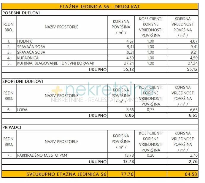 Stan S6 ima sveukupnu površinu od 77,76 m (obračunski 64,53 m), a sastoji se od: