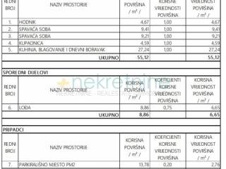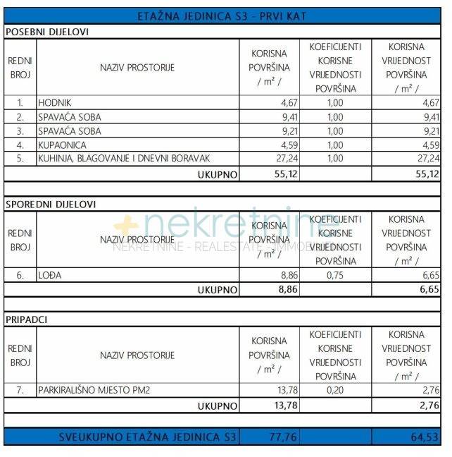 Stan S3 ima sveukupnu površinu od 77,76 m (obračunski 64,53 m), a sastoji se od: