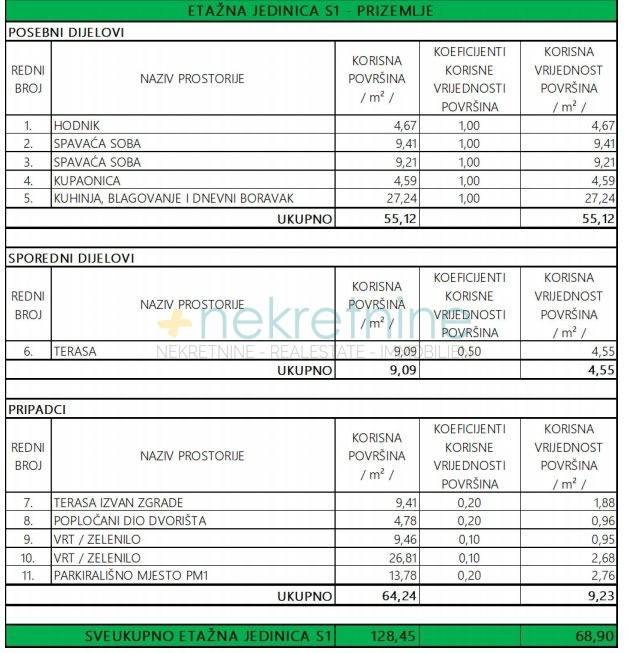 Stan S1 ima sveukupnu površinu od 128,45 m (obračunski 68,90 m), a sastoji se od:
