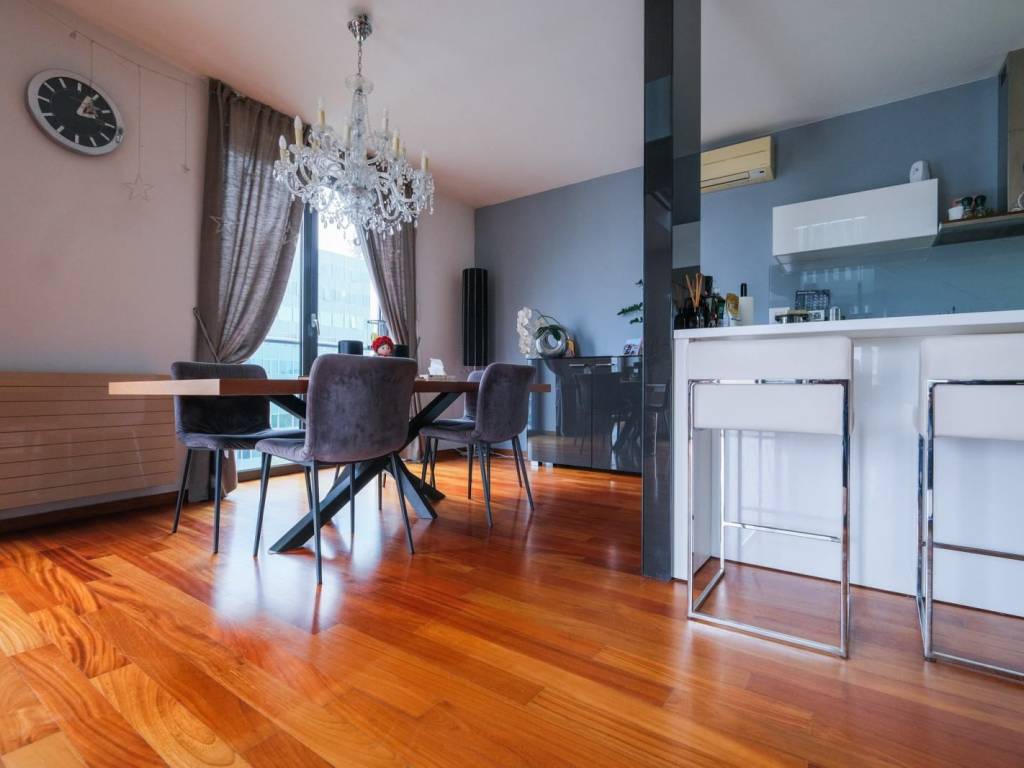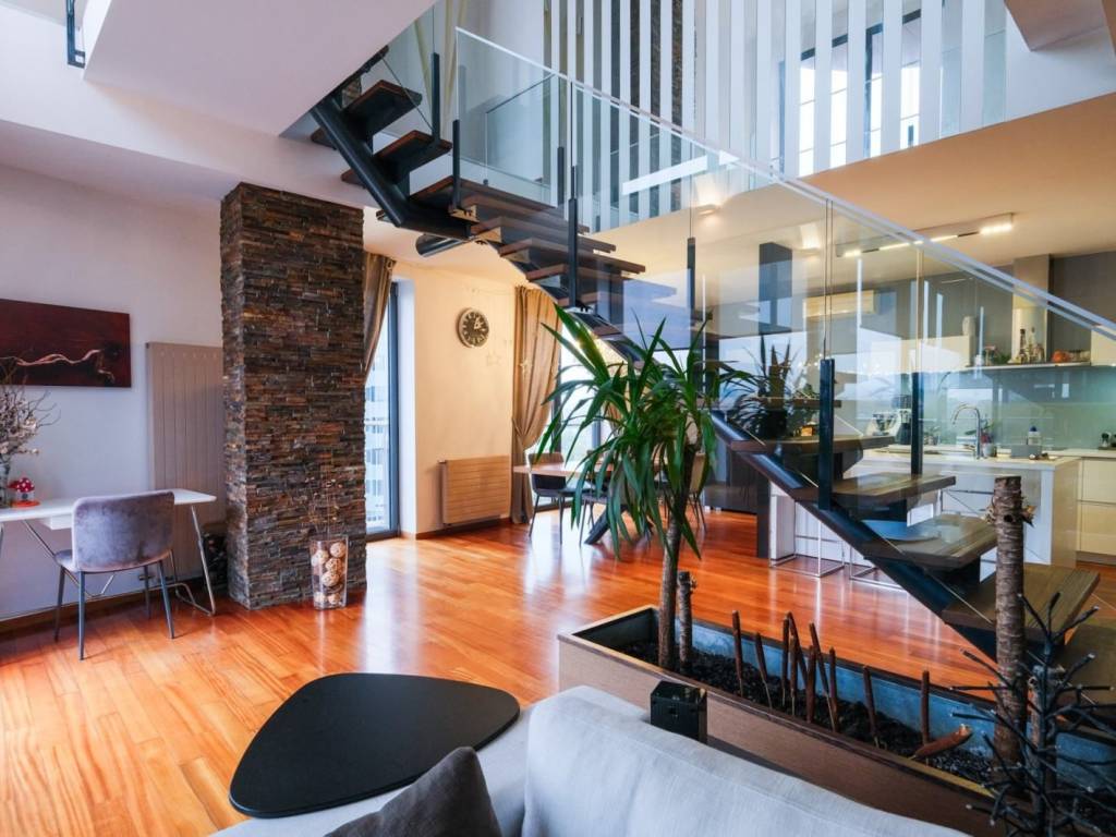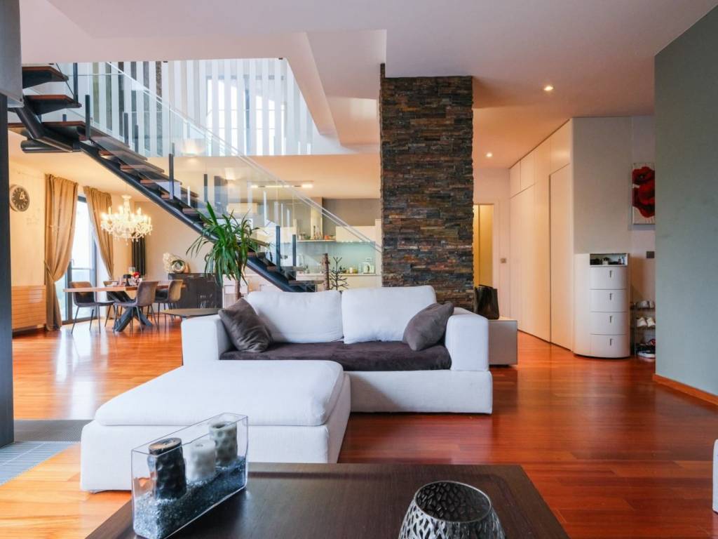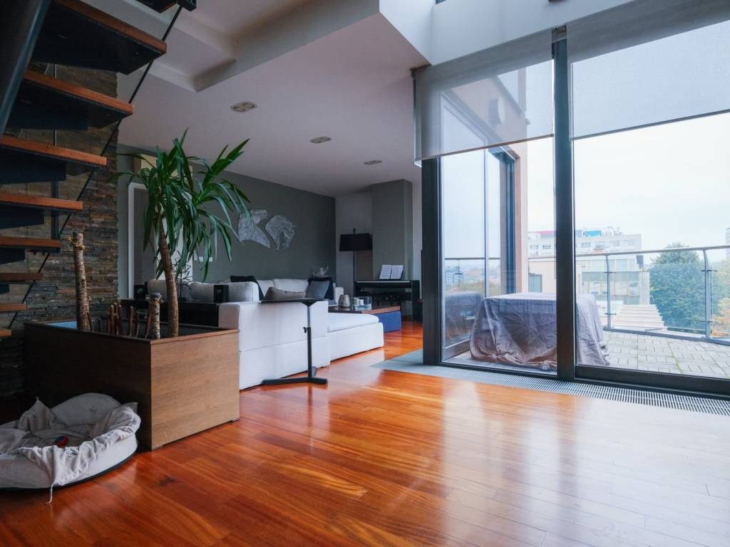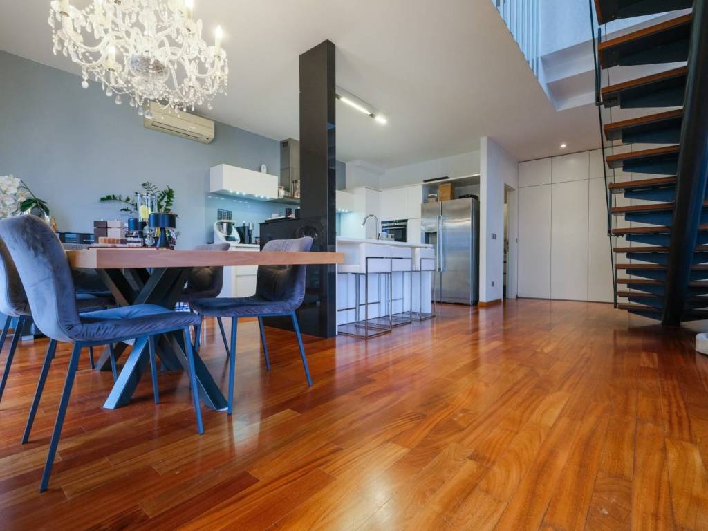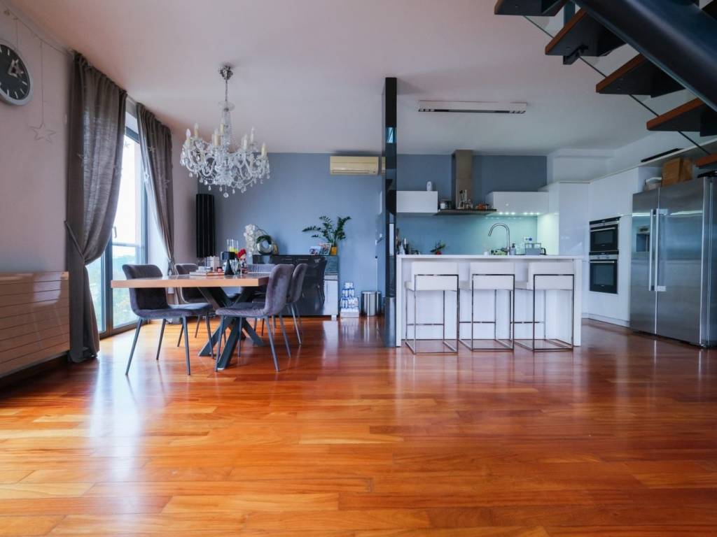 Odličan tlocrt smisleno povezuje prostor tvoreći jedinstvenu nekretninu koja se proteže na dvije etaže, uokvirena velikim staklenim stijenama i visokim stropovima koji stan čine elegantnim, ugodnim i prozračnim s mnogo svjetla. Sofisticiran dojam koji stan pruža zaokružen je modernim i decentnim uređenjem te efektnim stepeništem.