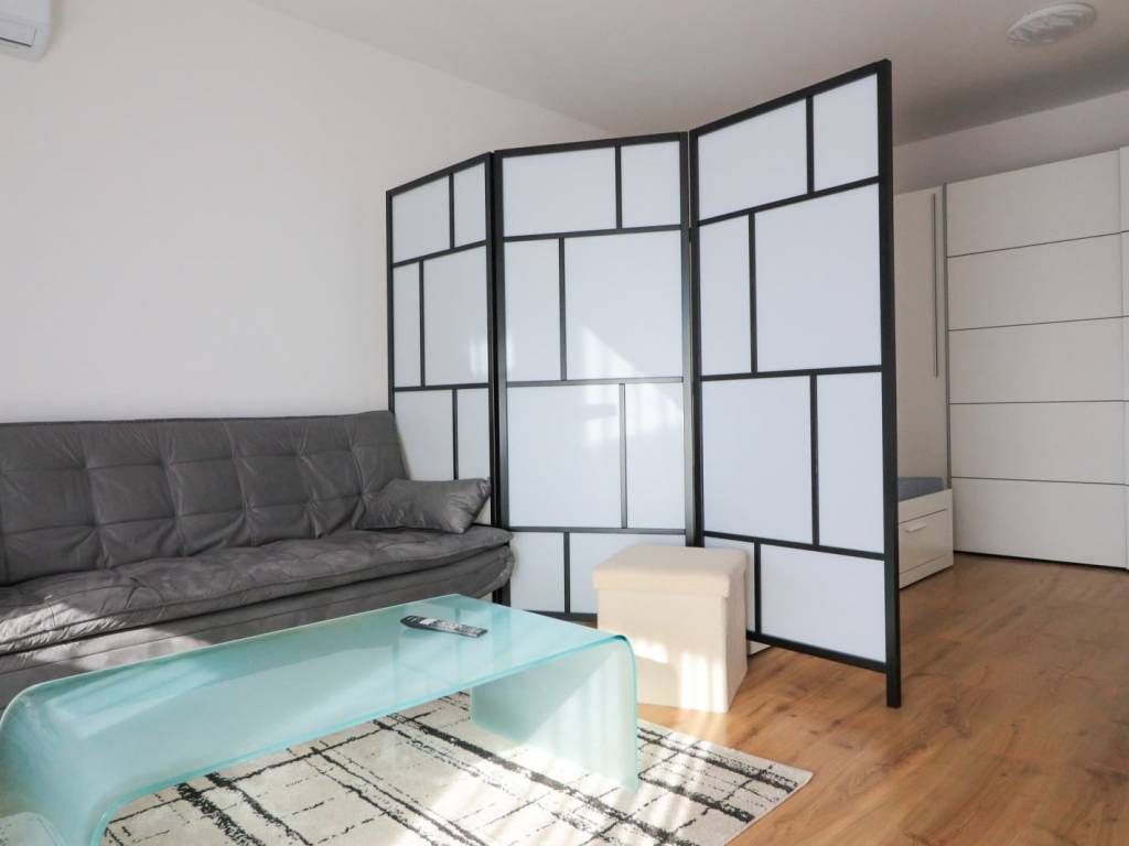 Stan je lijepo i moderno uređen a sastoji se od ulaznog hodnika, kupaonice, kuhinje s blagovaonskim dijelom, spavaće sobe koja je spojena s dnevnim boravkom i balkona.