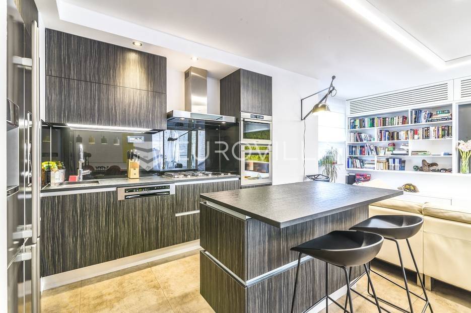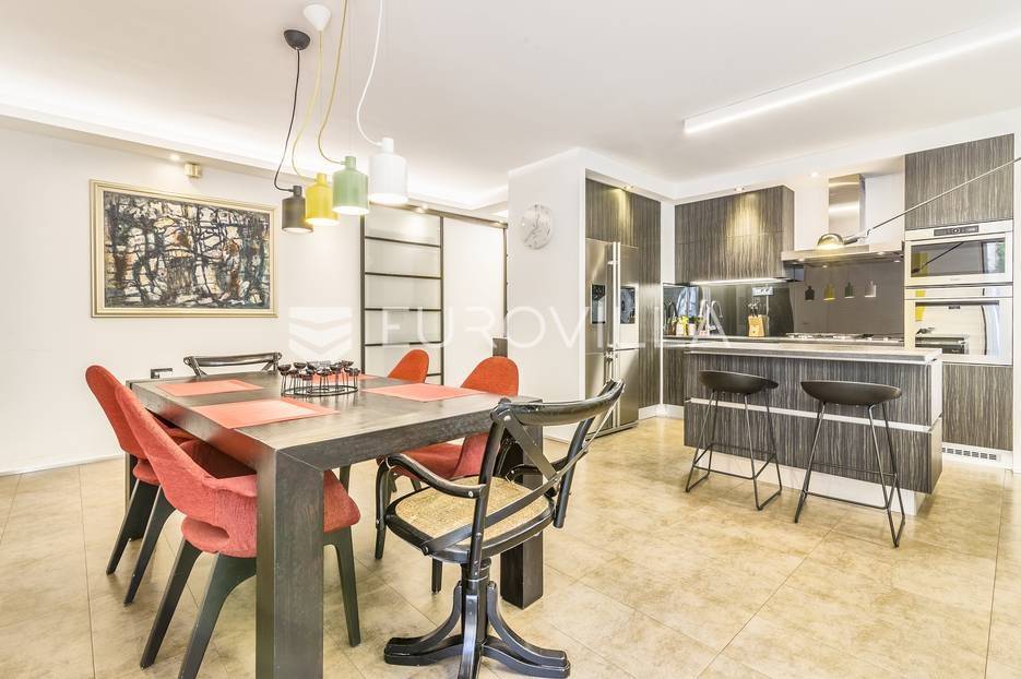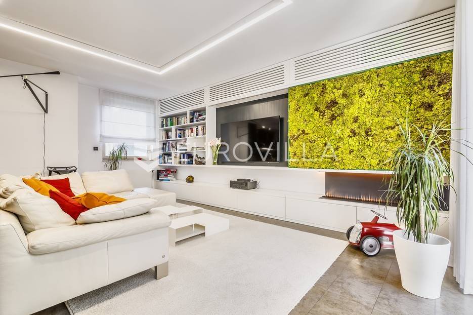 Centar, Medvedgradska ulica, izvrstan četverosoban stan u novijoj gradnji (2000.) na 2. katu s liftom. Stan je vrhunski kompletno adaptiran i dizajnerski uređen 2017. godine. Zatvorene površine 123,50 m2 s dvije velike terase od 28,07 m2 (7) i 18,72 m2 (4,68), dvije ostave 5,96 m2 (1,49) te garažnog parkirnog mjesta od 12,94 m2 (9,7). Sastoji se od ulaznog hodnika, garderobe za cipele i jakne, open space dnevnog boravka s kuhinjom i blagovaonicom te izlazom na terasu, master spavaće sobe s garderobom, kupaonicom i terasom koju je moguće zatvoriti, dvije dječje spavaće sobe, izdvojenog prostora - vešeraja, te još jedne kupaonice s kadom. Stan je vrhunski opremljen - troslojna aluminij-drvo stolarija s komarnicima, podno grijanje u prostoru kuhinje boravka i blagovaonice, dizajnerska rasvjeta, vrhunska kuhinja s otokom po mjeri, kamin u dnevnom boravku, klime u svakoj prostoriji... Sve dodatne informacije na upit.