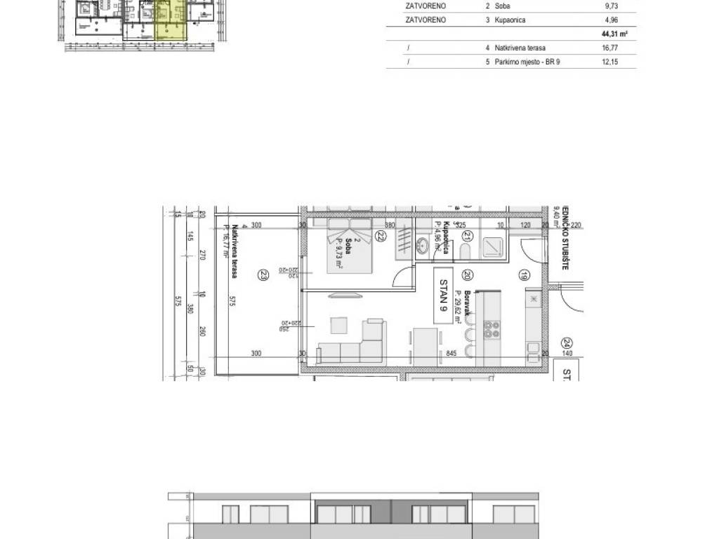 Sastoji se od: jedne spavaće sobe, dnevnog boravka + kuhinja + blagovaona, kupaonice i terase.