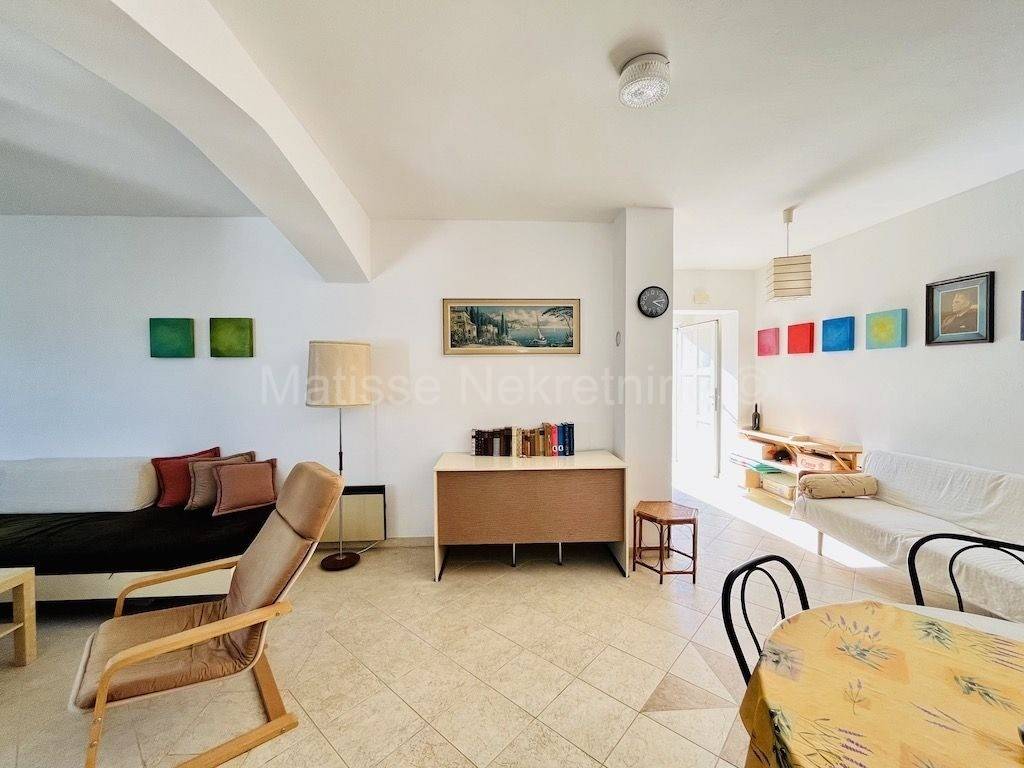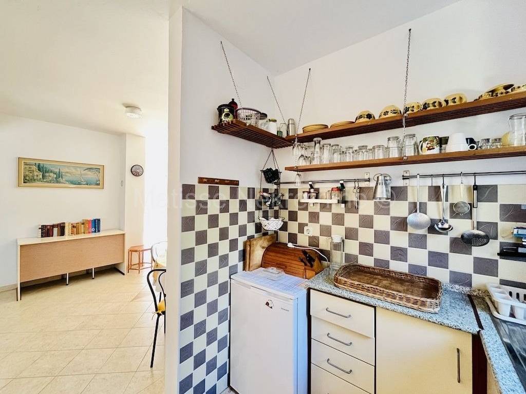 The apartment is entered from the parking lot through a hallway that leads to an open-space area that serves as a living room, and from which there is an exit to a spacious terrace. The advantage of this apartment is the possibility of stairs that lead from the terrace to the yard, which the previous owner paved with stone in an authentic Istrian style. Here you can enjoy the privacy of your garden, in the shade of a quince tree. The apartment has one bedroom, a bathroom, and a kitchen with a window that also overlooks the greenery. Everything is decorated with attention to detail in a special vintage style.