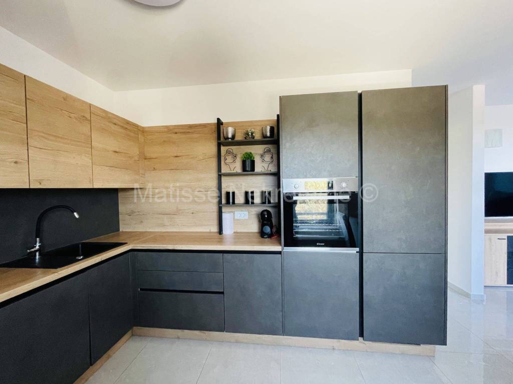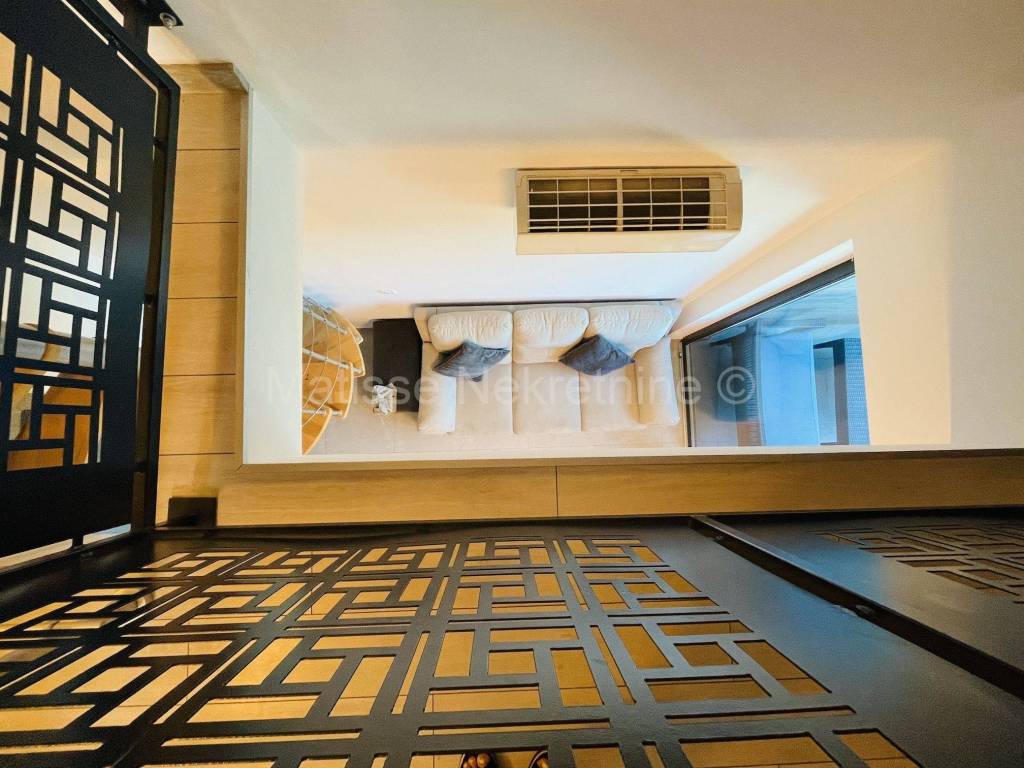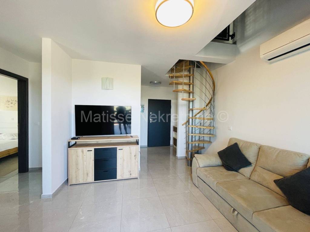 The apartment spans two floors, occupying the first floor and the attic. The spacious living room is connected to the kitchen and dining area and opens onto a loggia. The sea view can be enjoyed from the loggia and from the kitchen window. On the same floor, there is one bedroom, a bathroom, and stairs leading to the upper floor, which features a spacious bedroom of almost 45m. The apartment includes a storage room and a garage parking space.