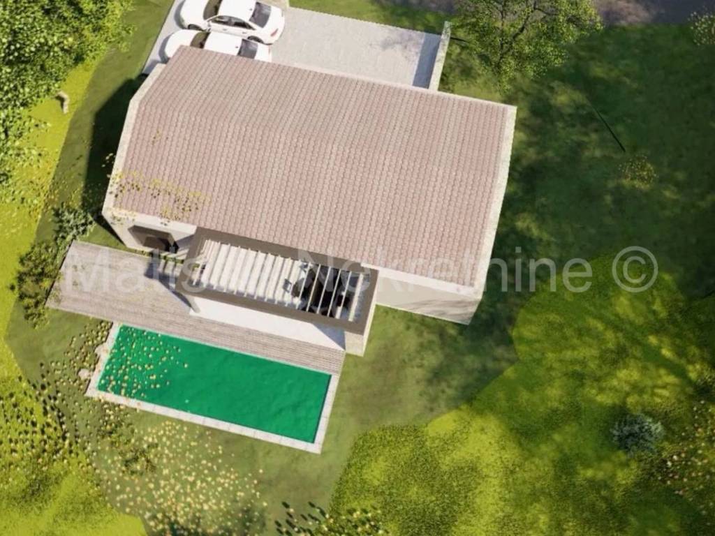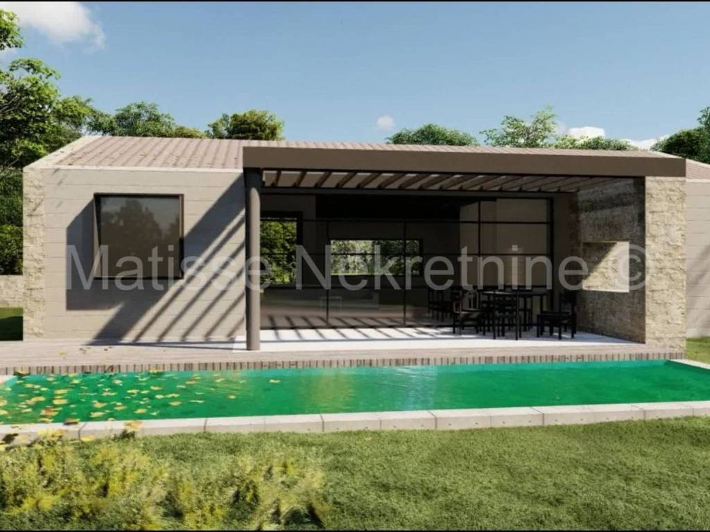 Zemljište je površine 610m2 te ima ishodovanu građevinsku dozvolu za gradnju kuće s bazenom. Kuća se po projektu sastoji od ulaznog hodnika, open space dnevnog boravka s kuhinjom i blagavaonom, 2 spavaće sobe, 2 kupaone, 2 spremišta te dvorišta gdje se nalaze 2 parkirna mjesta i bazen sa sunčalištem.