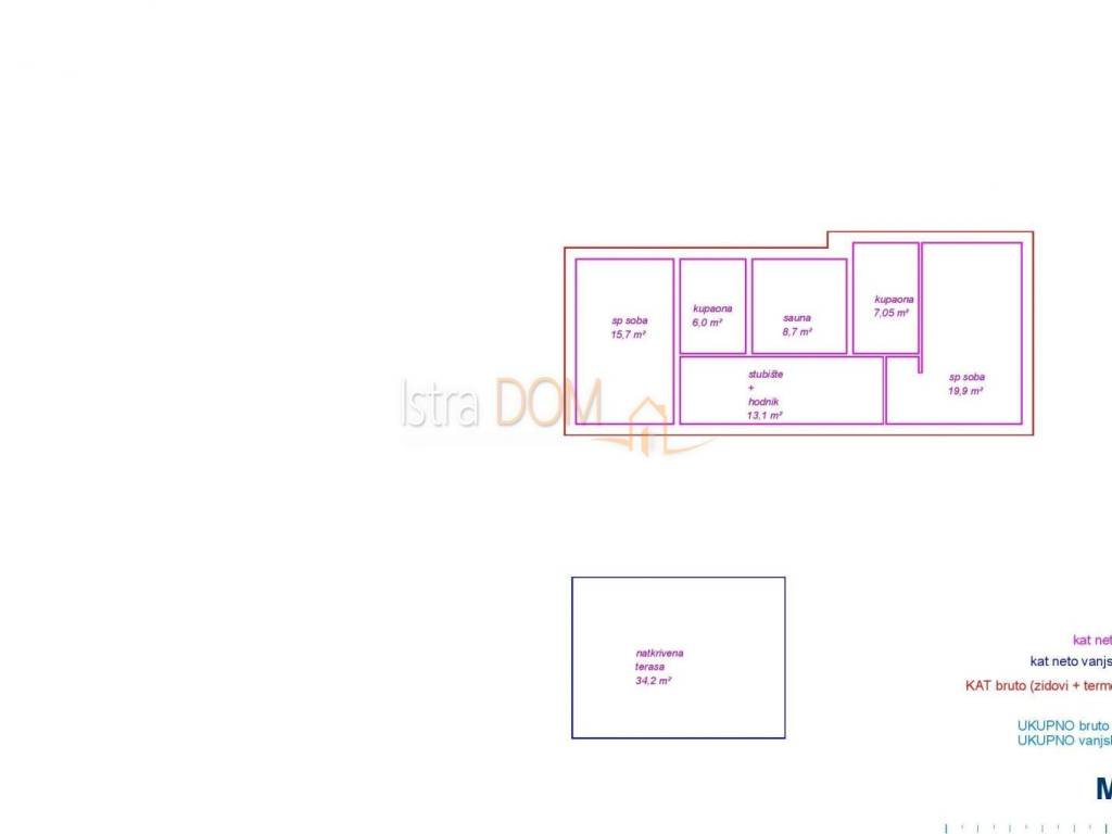 The ground floor has a spacious living room with kitchen and exit to the terrace and garden, two bedrooms, bathroom, guest toilet and laundry. on the first floor there are two more bedrooms with bathrooms, sauna with shower and a covered terrace with lounge and garden. The terrace offers a panoramic view of the Brijuni National Park, the sea, vineyards and olive groves.