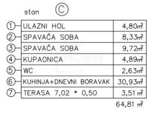 The apartment is located on the 1st floor of a newly built residential building with 11 residential units. The apartment has a surface area of 64.81 m2. The apartment consists of a living room with an open-space kitchen and dining room, 2 bedrooms, a bathroom, a toilet, a hallway and a covered terrace. The terrace is accessed from the living room. The terrace offers a view of Tar and nature.