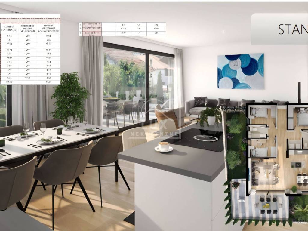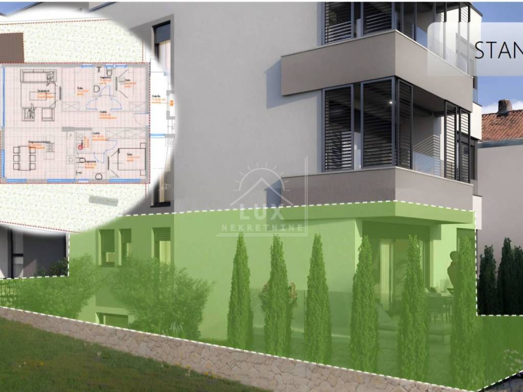 Stanu pripada i garaža oznake G1, jedno vanjsko parkirno mjesto (pov. 13.75 m2) i VRT (pov. 122.35 m2).
