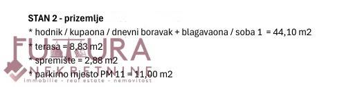 Sastoji se od: jedne spavaće sobe, dnevnog boravka + kuhinja + blagovaona, hodnika, kupaonice i terase.
