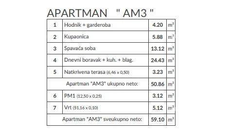 New residential project with 8 residential units, located in a prime location in Volme.Apartment AM3- is located on the ground floor of the building and consists of: hallway + wardrobe, bathroom, bedroom, living room with kitchen and dining room and garden (net 5.12m2)The apartment has a parking space PM1 which is included in the price.Apartment specifications:Exterior joinery - PVC with triple glazing and aluminum roller shutters with electric motor, facade - 12 cm thick demit on the first floor, 8 cm on the ground floor plus 2 cm Travertino bianco stone, cooling and heating - Mitsubishi air conditioners and electric underfloor heating in all rooms with wi-fi thermostats, final floor coverings - Marca Corona ceramic tiles.Interior designs are made for each apartment separately.For additional information, please contact:Azra+385 91 611 5706+385 98 420 885azra@almadominvest.com