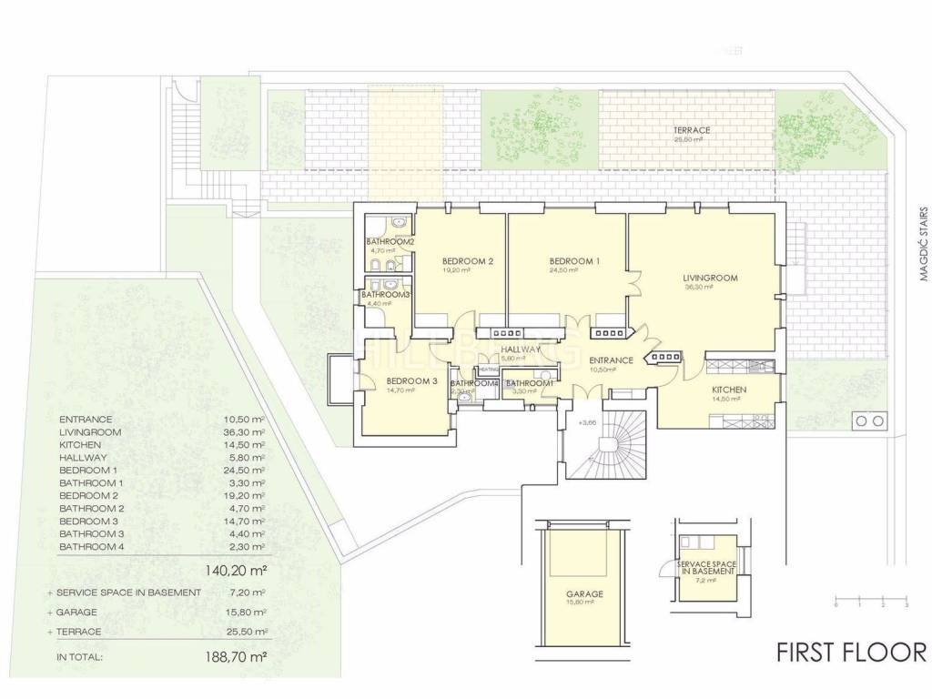 Terrace (25 m2). Garage for 1 car (not a requirement). Separate laundry room.