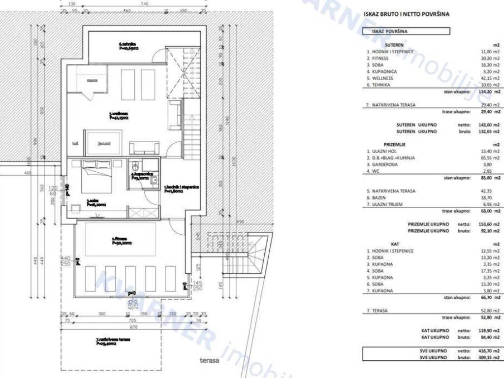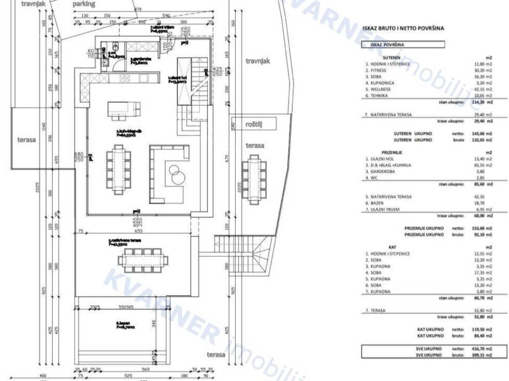 Kuća prema projektu ima 416m², a sastoji se od suterena, prizemlja i kata.
