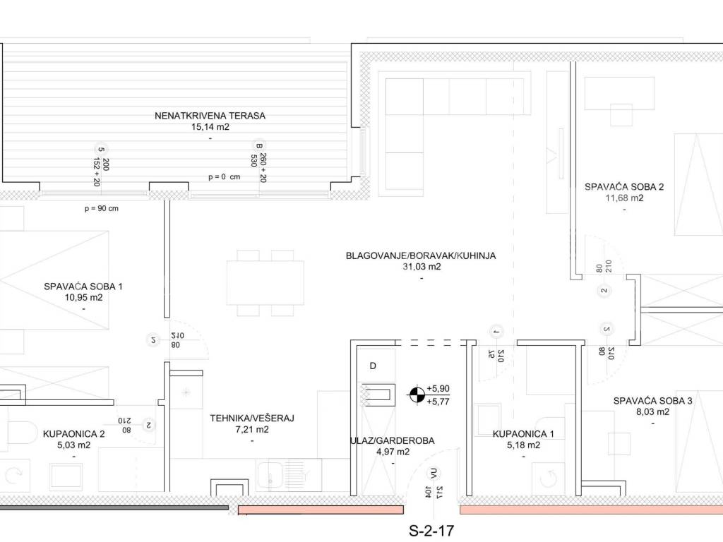 Stan S-2-17 smješten je u potkrovlju i idealan je za obitelji koje traže prostran i luksuzan dom s dodatnim prostorima i funkcionalnim rasporedom. Ovaj stan nudi savršenu ravnotežu između estetike i praktičnosti, osiguravajući ugodan životni prostor u mirnom okruženju.