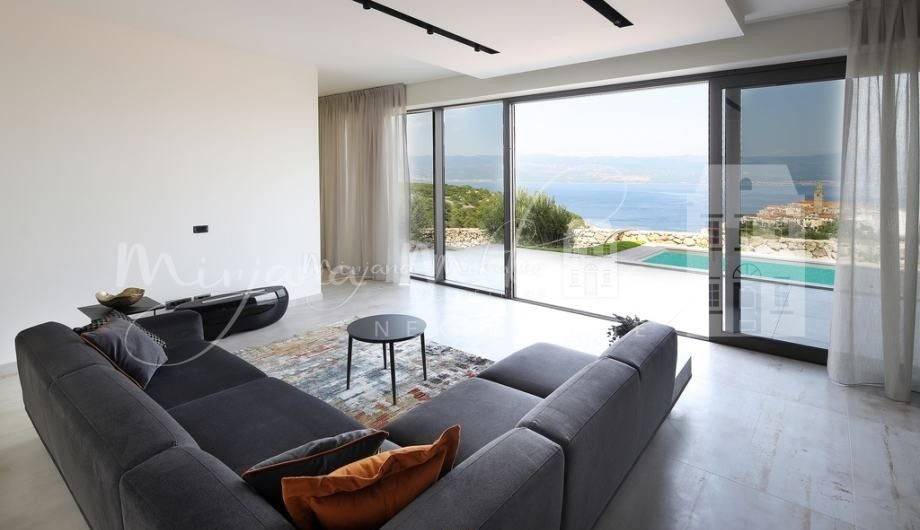 Cijeli interijer odiše sunčevom svjetlošću zahvaljujući staklenim stijenama vrhunske aluminijske stolarije koja povezuje dnevni boravak sa izlaskom na kamenu terasu i pogledom na cijeli grad Vrbnik.