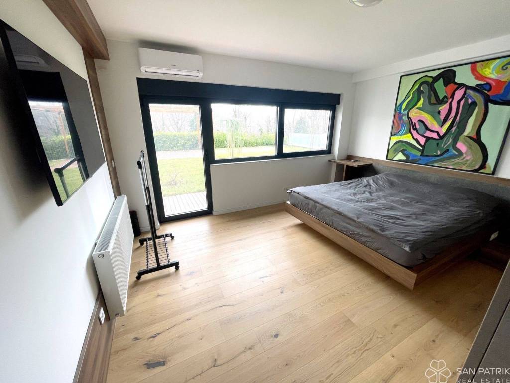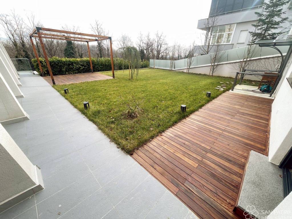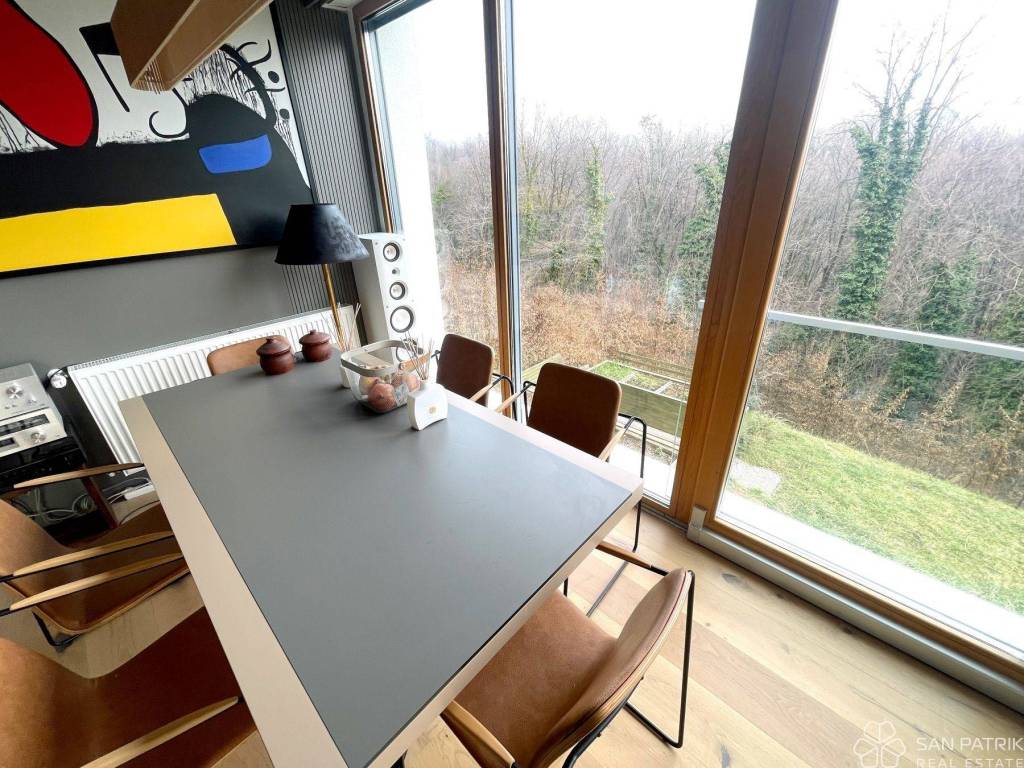The interior of the apartment reflects sophistication and elegance in every detail. It consists of an entrance hall, a spacious kitchen with a dining area and living room that opens to a covered terrace and a large garden, offering a beautiful view of Jelenovac Forest Park. Additional value to the space is provided by a guest toilet, two smaller rooms with a shared bathroom, a utility room with a wardrobe, a room with a bathroom, and a master room with its own bathroom equipped with a sauna.