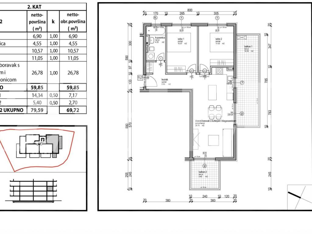 Stan D2, na drugom katu, sastoji se od ulaznog hodnika, dnevnog boravka s kuhinjom i blagavaonicom, tri spavaće sobe i dvije kupaonice, ukupne površine 73,40 m2. Stan ima balkon od 25 m2, cijena 320.000 eura