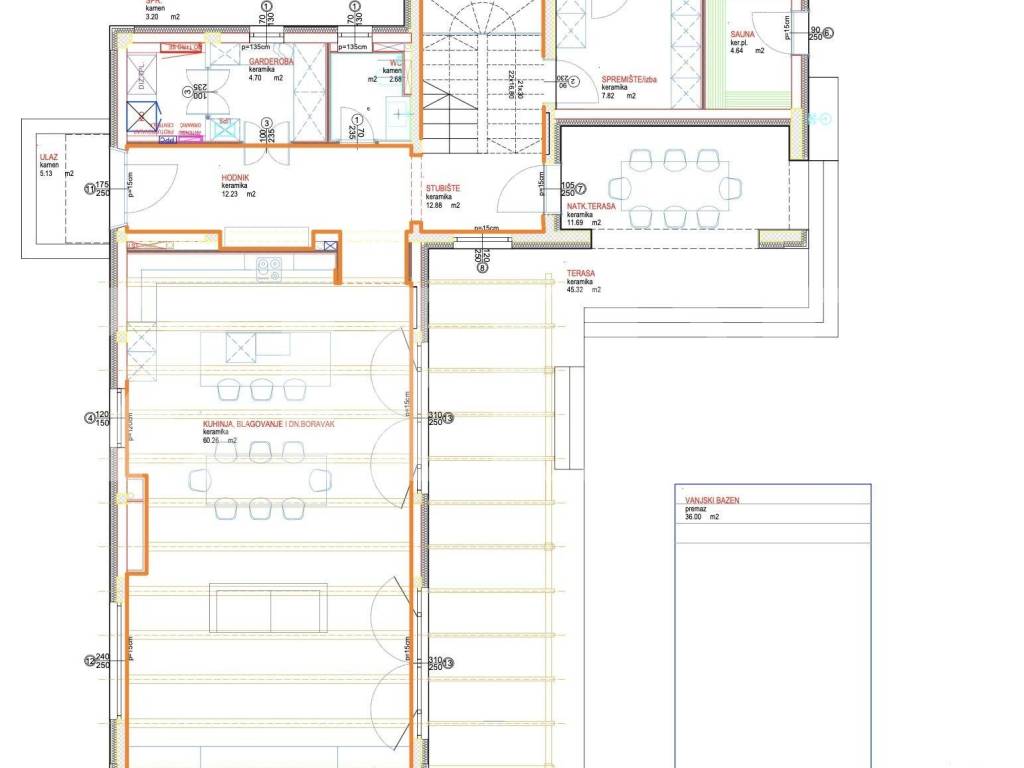 Iz dnevnog boravka se izlazi na veliku teras od 45 m2, sa koje se ulazi na natkrivenu terasu od 12 m2, izmešu kojih je bazen od 36 m2.