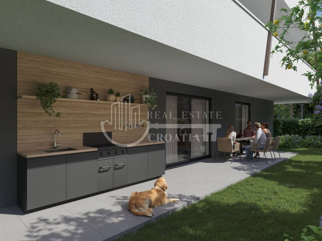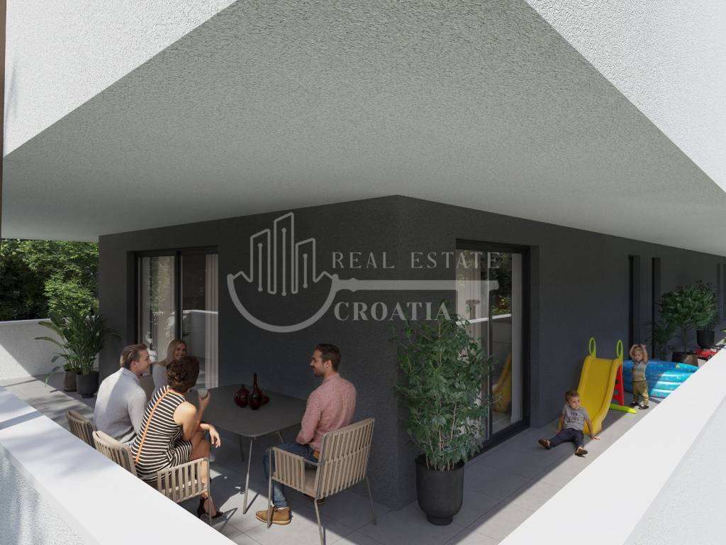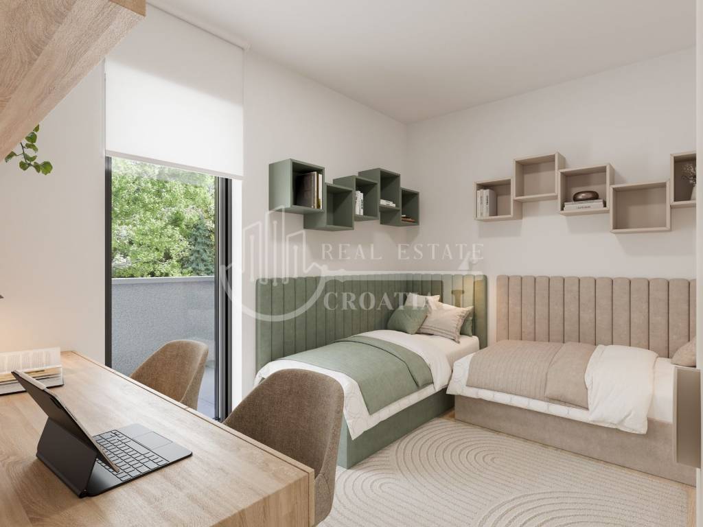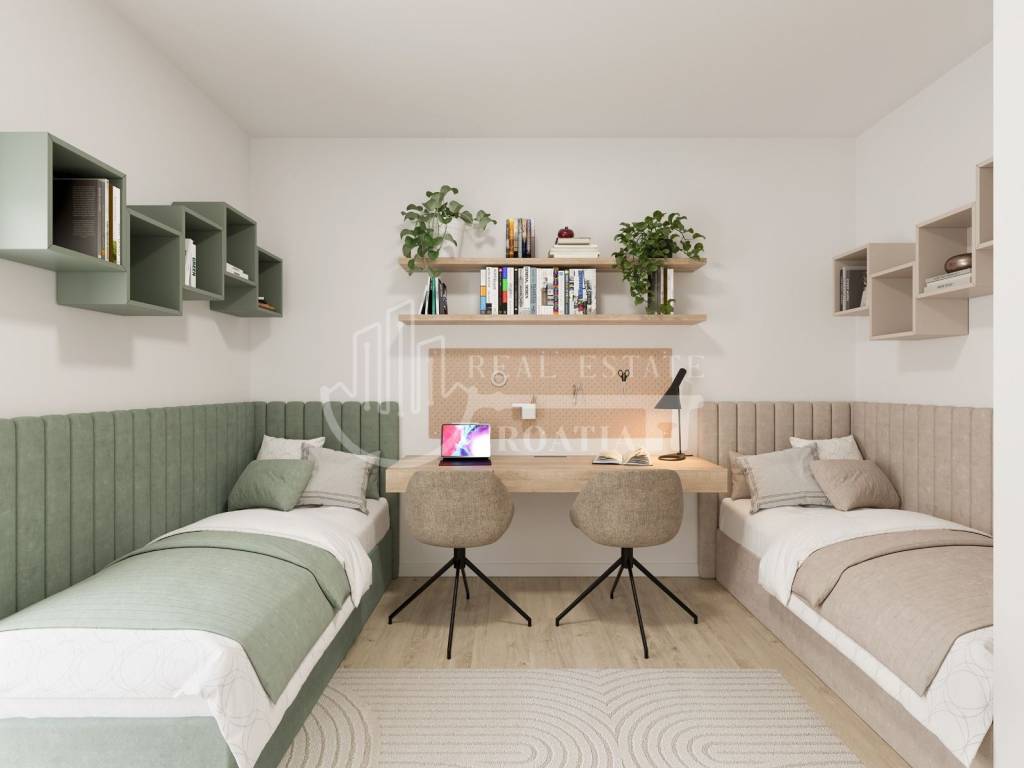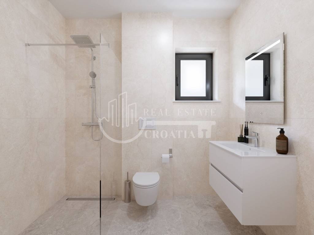 Kupacne plaća porez na promet nekretnina niti agencijsku provizijuPOVRŠINA STANA:- 64.76 m - unutarnja, podna površina- ukupna prodajna površina stana iznosi 104.05 m s pripadcima (parkirno mjesto - 12.50 m, natkriveni balkon - 72.18 m, montažno spremište - 2 m) obračunato prema pripadajućim koeficijentima.STAN SE SASTOJI OD:- ulaznog hodnika (12.96 m)- dnevnog boravka blagovaonicom i kuhinjom (24.22 m)- kupaonice (4.07 m)- dvije spavaće sobe (11.18 m i 12.33 m)Orijentiran je na jug, zapad i istok. Pripada mu jedno vanjsko nenatkriveno parkirno mjesto površine 12.50 m.Zgrada je u izgradnji, a predviđeni rok za završetak je proljeće 2026. godine.OPREMA:- Marlex PVC stolarija s troslojnim IZO staklom te aluminijske rolete na elektro motore- stiropor fasada debljine 15 cm- keramičke pločice 1. klase- parket prilagođen za podno grijanje na podovima- kupaonica opremljena sanitarnim uređajima- podno grijanje dizalicom topline, svaka soba ima termostat- klima uređaj u svakoj sobi- priprema za solarne panale- priprema za ljetnu kuhinju na terasi- priključak za električno napajanje automobila kod svakog parkirnog mjesta- dizalo marke Schindler- video nadzor zajedničkih prostorija