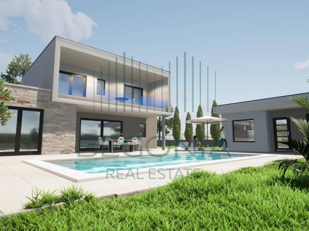 Prostire se na dvije etaže, a okružena je zelenilom i lijepo uređenom okućnicom na kojoj će se nalaziti veliki bazen i pomoćni objekat sa ljetnom kuhinjo, gym-om i kupatilom.