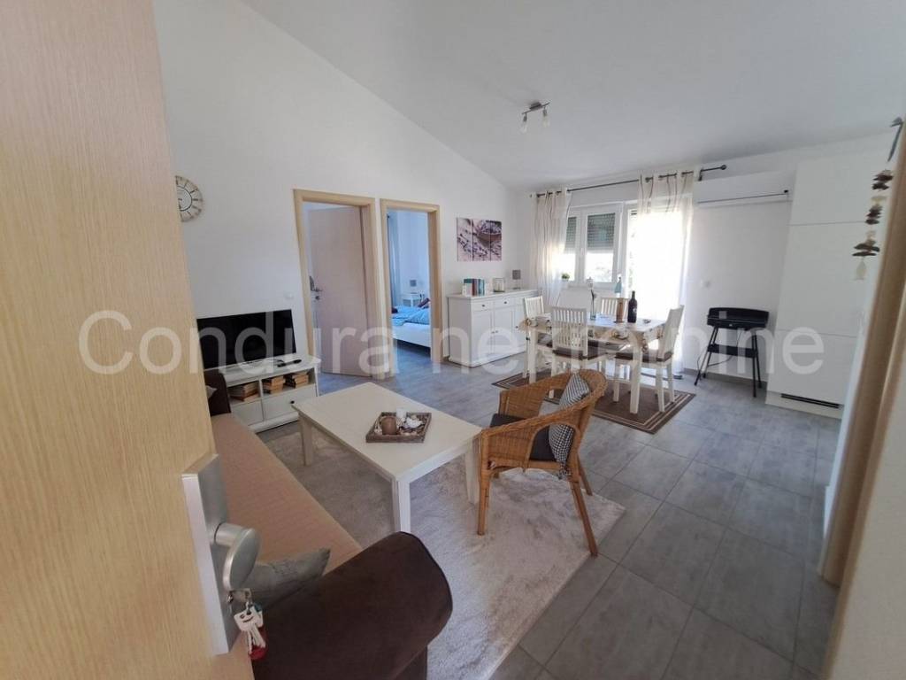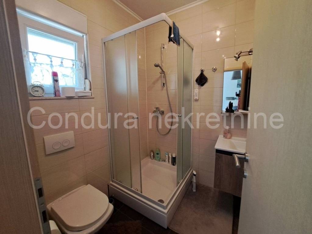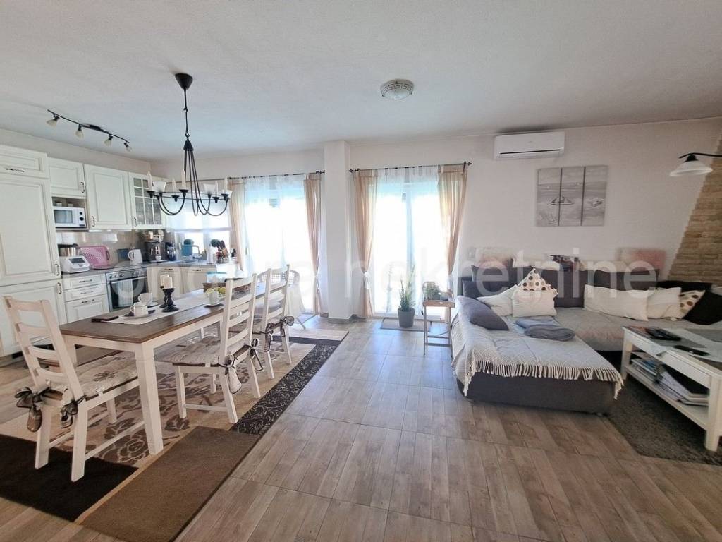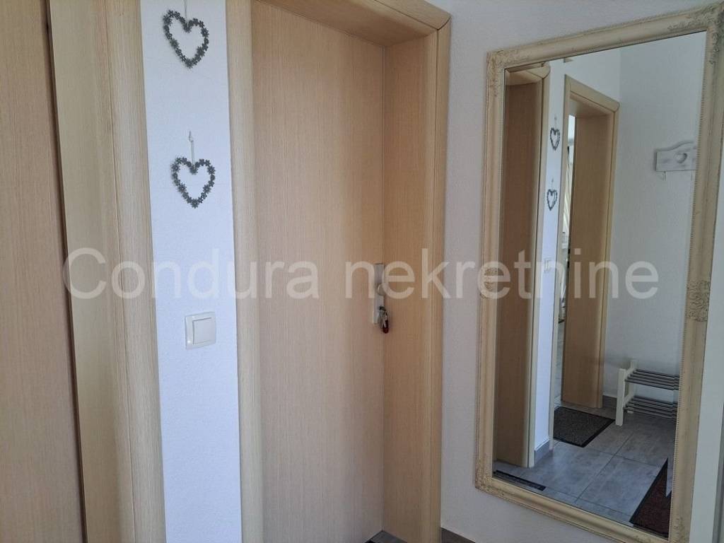 On the first floor there are two separate two-bedroom apartments (50 m2 and 46 m2) with a common entrance area, and each of them consists of: two bedrooms, a bathroom, a living room with a dining room and a kitchen. One apartment has access to a large balcony of 28.51 m2 covered with a pergola, while the other apartment has access to a balcony of 7.68 m2.
