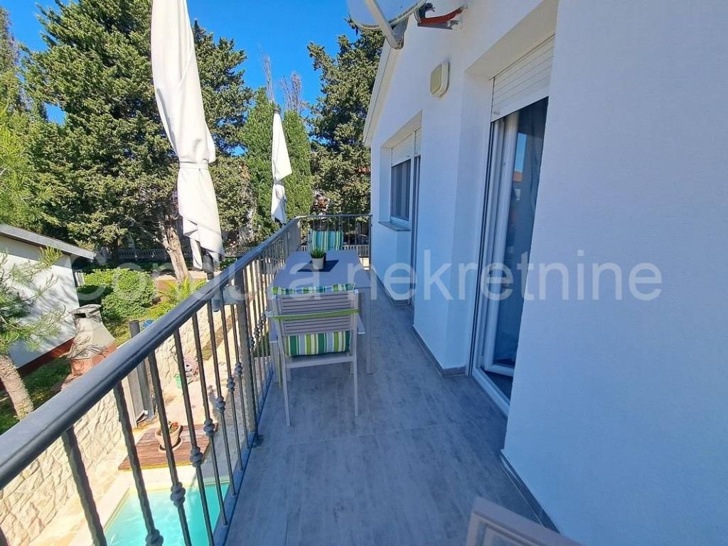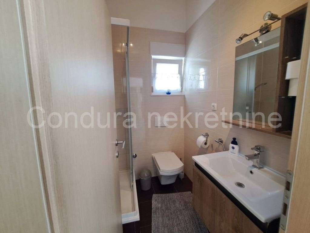 On the ground floor, over the entire floor, there is a large two-bedroom apartment consisting of the following rooms: open space living room with kitchen and dining room, two spacious bedrooms, each with its own bathroom, storage room and entrance hall. In the storage room there is a door that leads to the garage of 23.38 m2. From the living room through glass doors there are exits to two terraces - one large terrace with a swimming pool (5m x 3m) next to which there are many places for sunbathing with deckchairs and an outdoor shower and a wooden table with benches for sitting as a place to socialize while eating. The second, smaller terrace serves as a place to rest and enjoy the greenery of the plants found there.