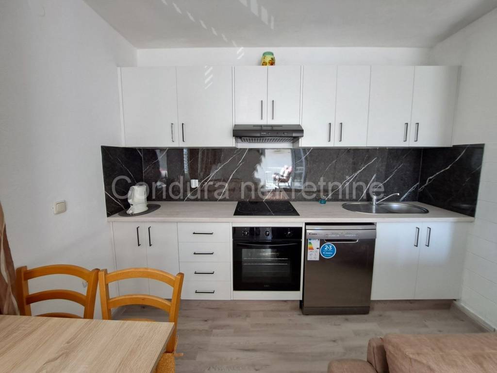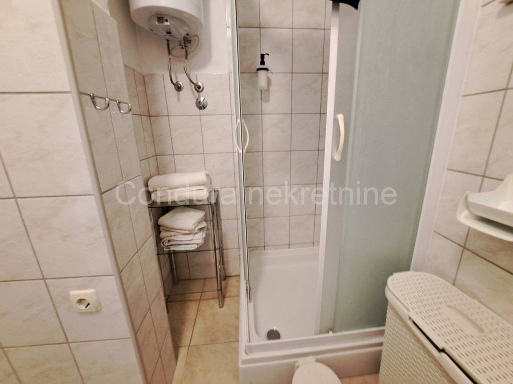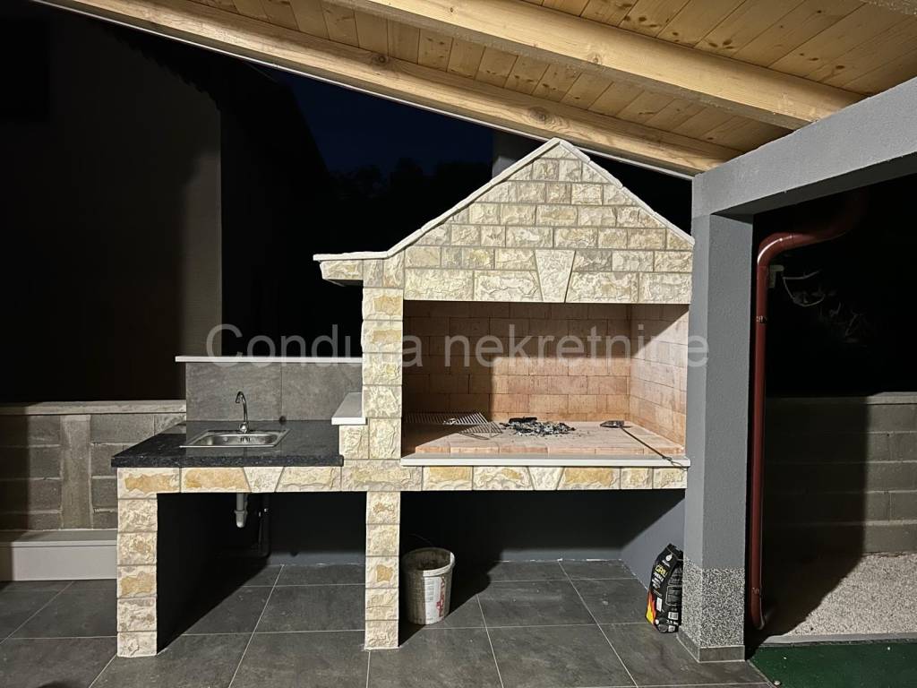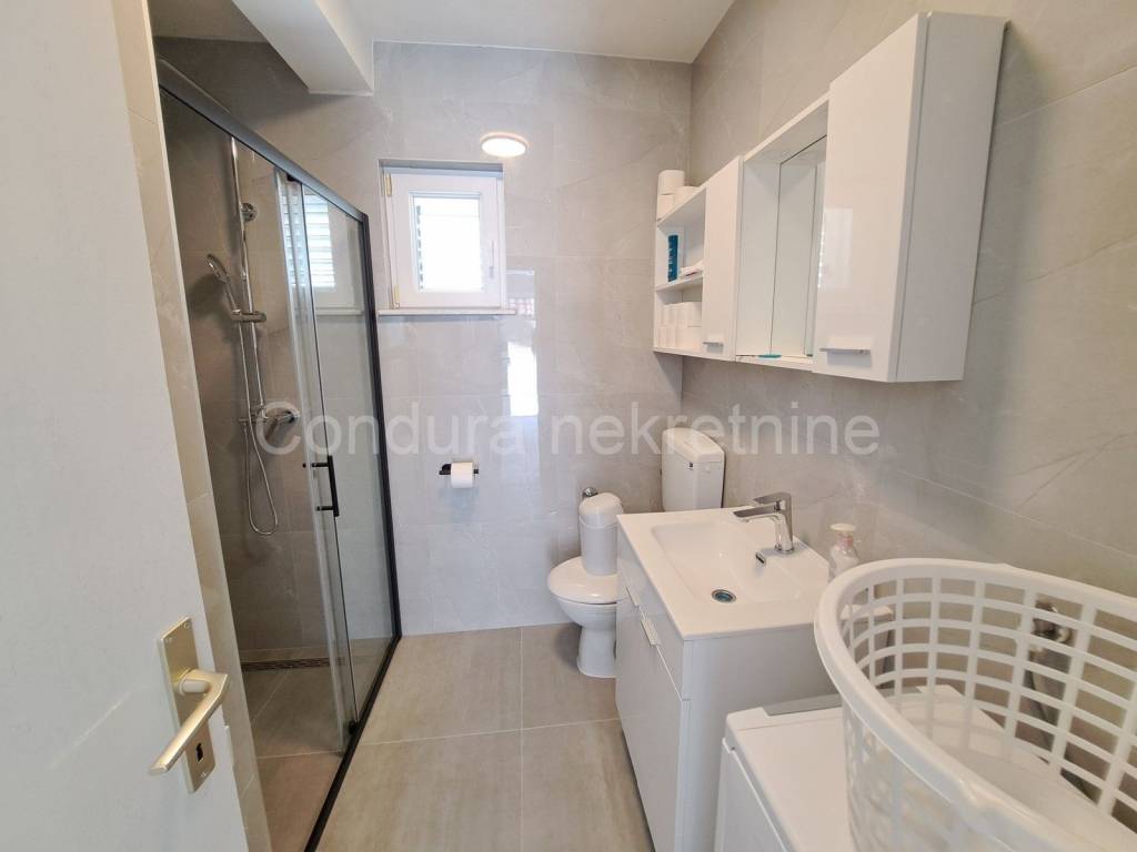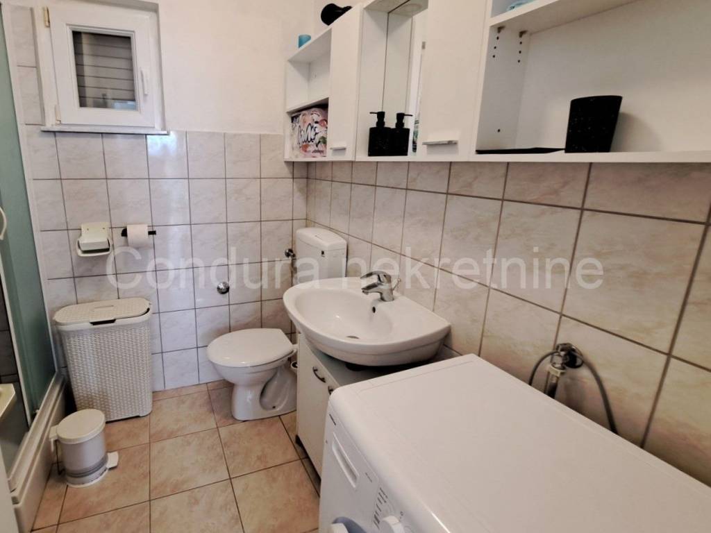 On the 1st floor, which is reached by an external staircase, there is also an apartment with the same arrangement of rooms as on the ground floor, and it also consists of a hallway, a living room with a kitchen and a dining room, two bedrooms and a bathroom. The living room leads to a balcony of 12.40 m2 with a view of the sea. In the ceiling of the corridor there are retractable stairs that lead to the attic.